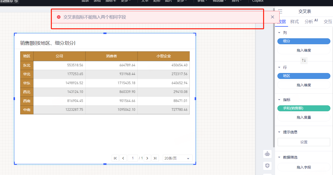 【新增】交叉表重复拖入同个度量字段增加提示。