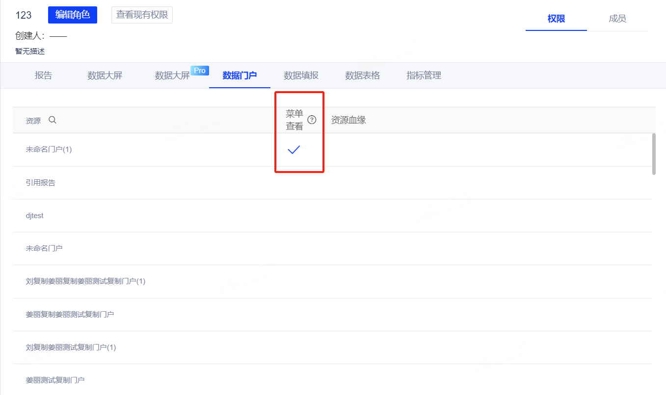【新增】门户及菜单查看权限可在角色管理/资源管理配置,门户和门户菜单权限可跟随门户引用的资源,有资源权限即可查看对应的门户及菜单。