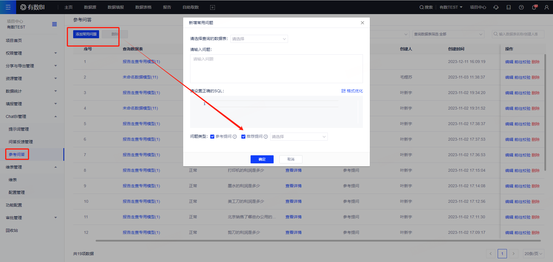 【新增】ChatBI支持预设推荐问题,可自定义添加推荐问题,预设团队常用分析问题,他人直接选用即可生成报表,避免重复提问。