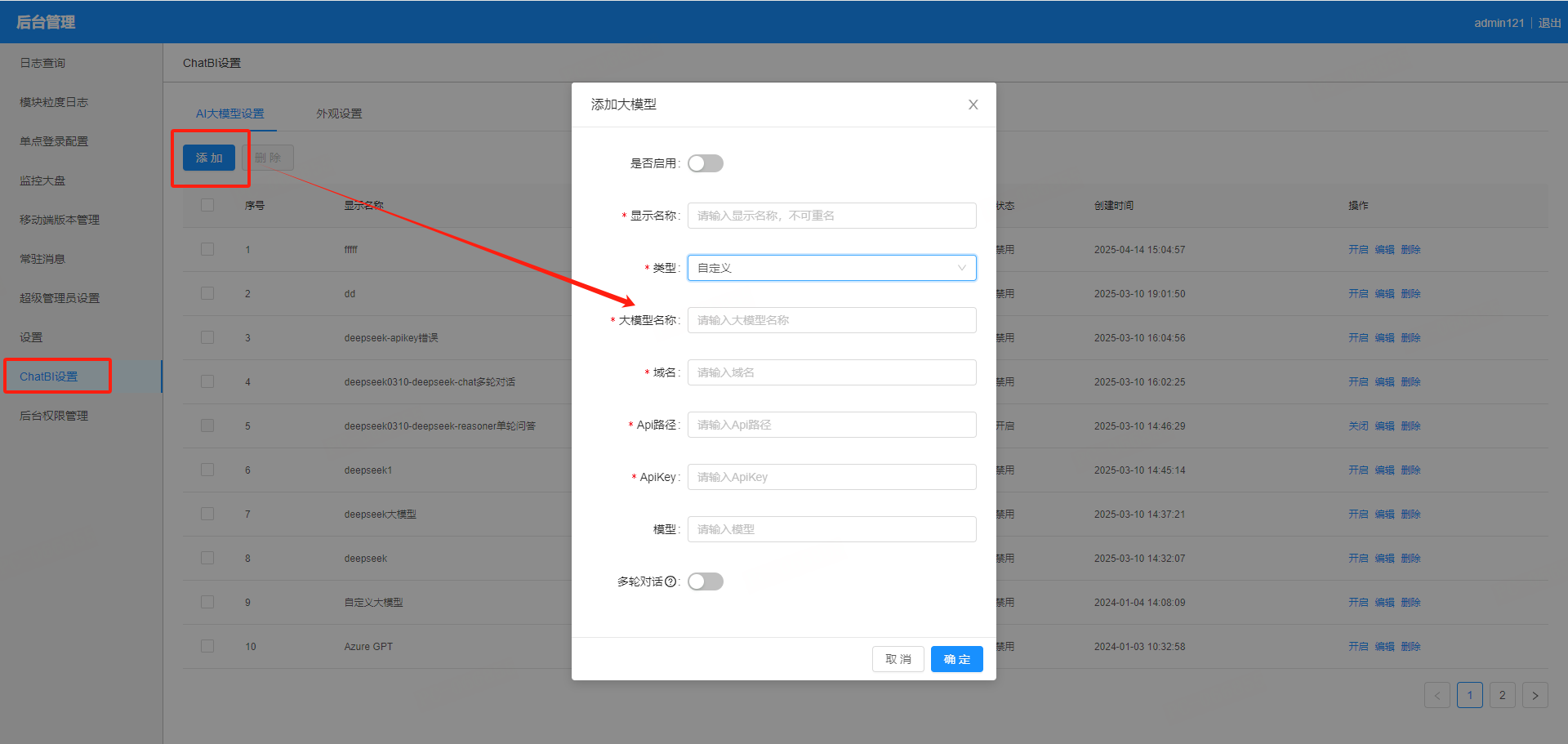 【新增】后台管理支持自定义配置大模型,可自定义配置并使用第三方大模型服务。