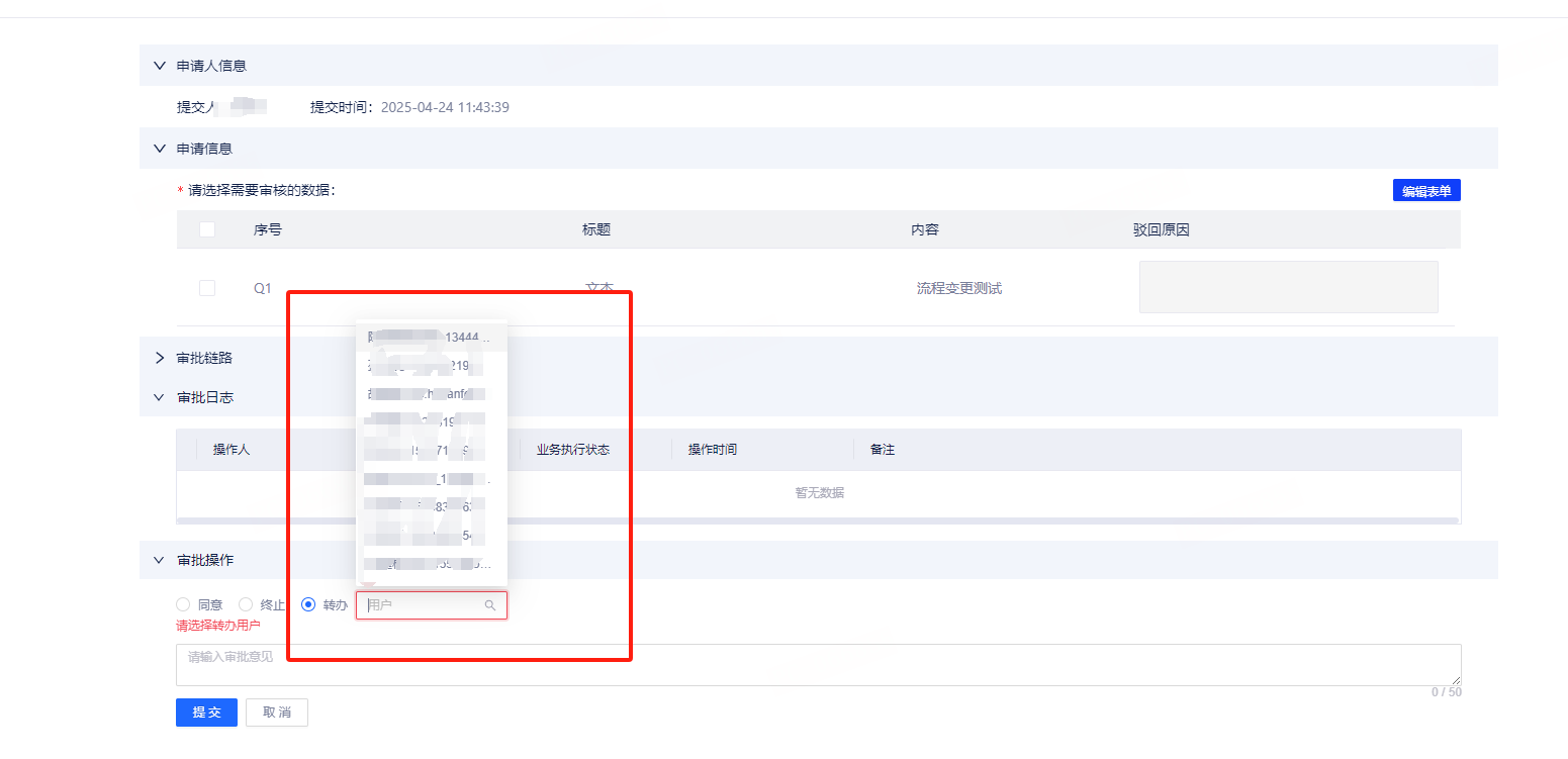 【新增】审批支持转办,当审批人临时无法处理时,可将审批转交其他负责人进行审批,避免流程停滞。