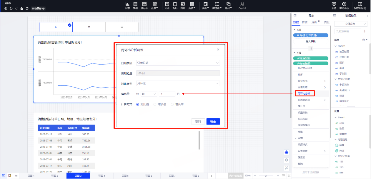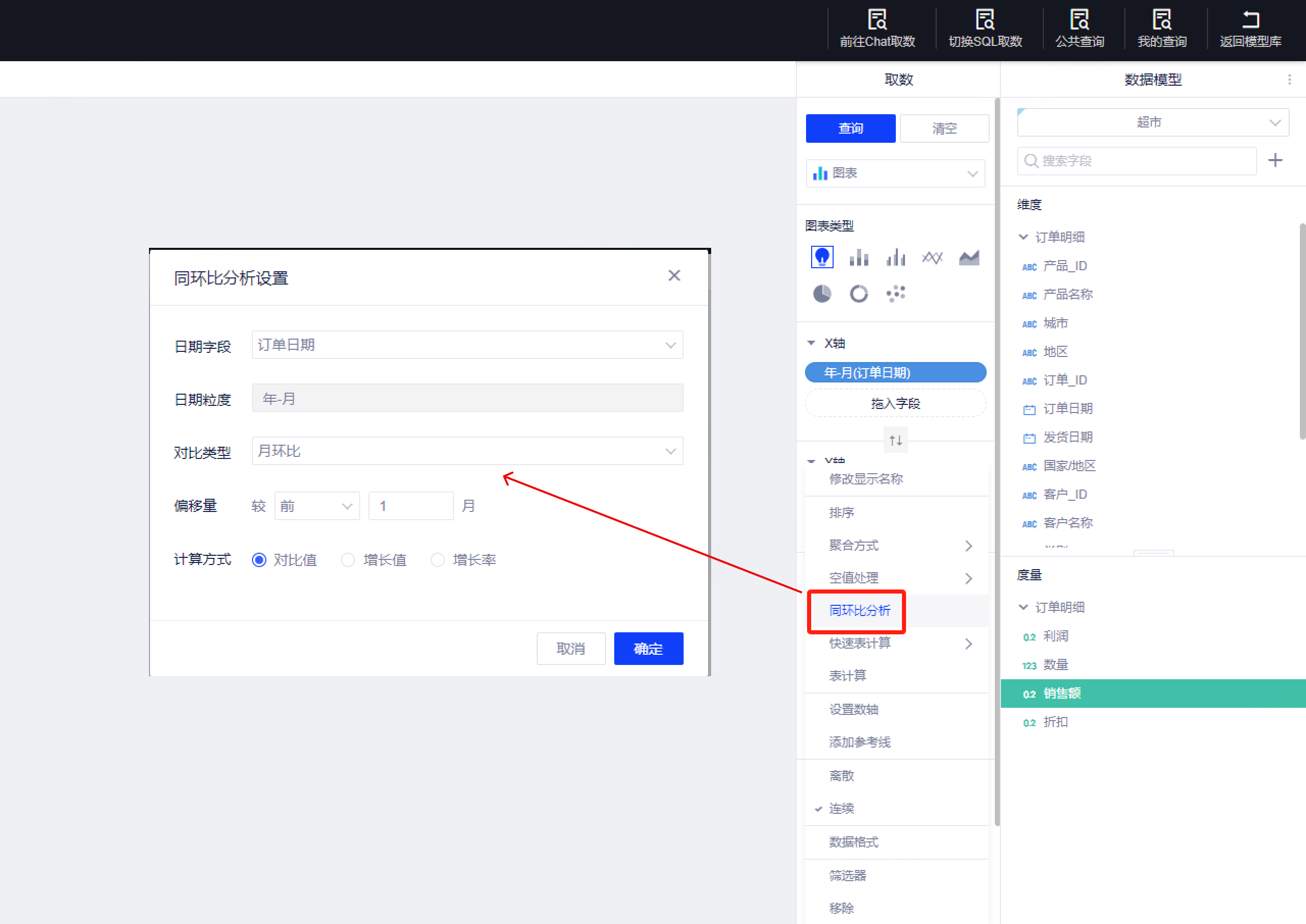 【新增】可视化取数图表度量字段支持同环比分析。