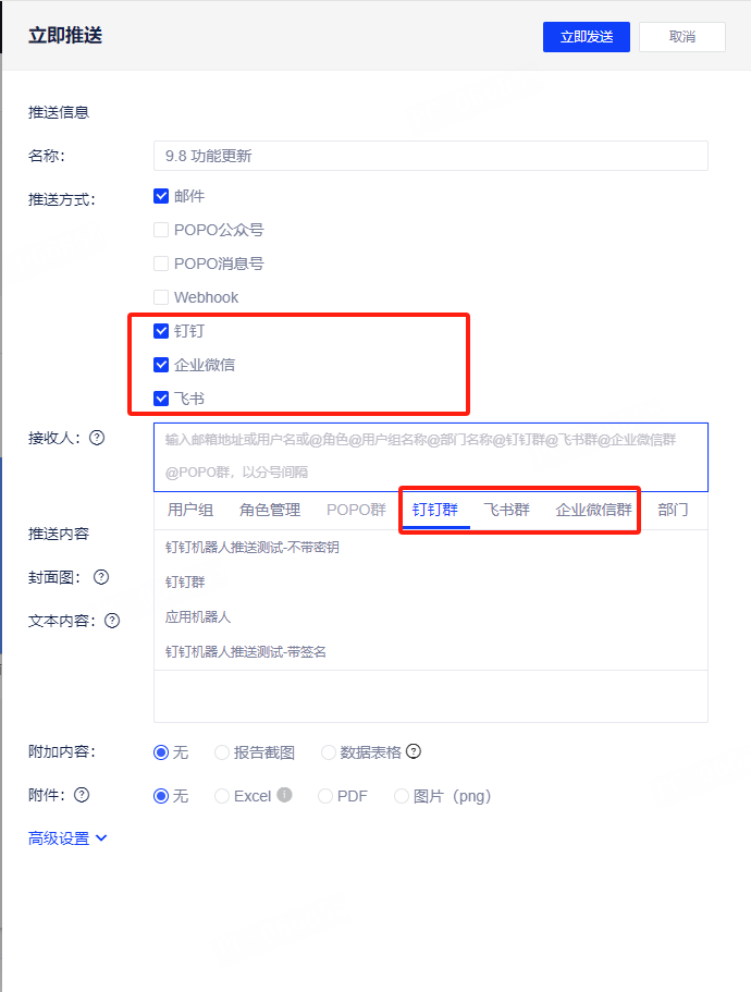 【新增】报告推送支持钉钉、飞书和企业微信,可推送至个人或群。群推送配置详见机器人配置。