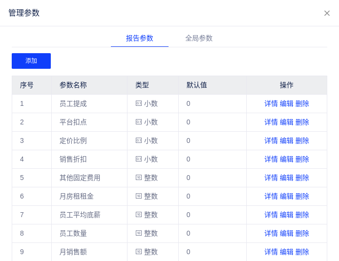 (2)同理,再依次创建「员工数量」、「员工平均底薪」、「月房租租金」、「其他固定费用」、「销售折扣」、「定价比例」、「平台扣点」、「员工提成」参数。创建完成后参数列表如下所示: