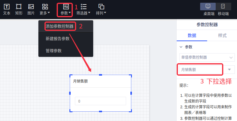 (1)以「月销售额」为例,在报告页面中添加一个空白参数控制器,类型选择为“单值参数控制器”,然后下拉选择参数“月销售额”,完成添加操作。