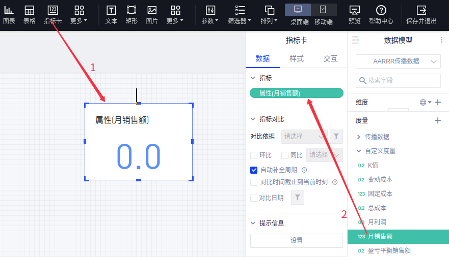 (1)以「月销售额」为例,创建一个空白指标卡,将「月销售额」字段拖入度量栏,然后汇总方式选择「属性」。如下图所示: