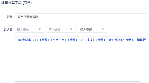 表达式:[固定成本]/(1-[参数].[平台扣点]-[参数].[员工提成]-[参数].[定价比例]/[参数].[销售折扣])