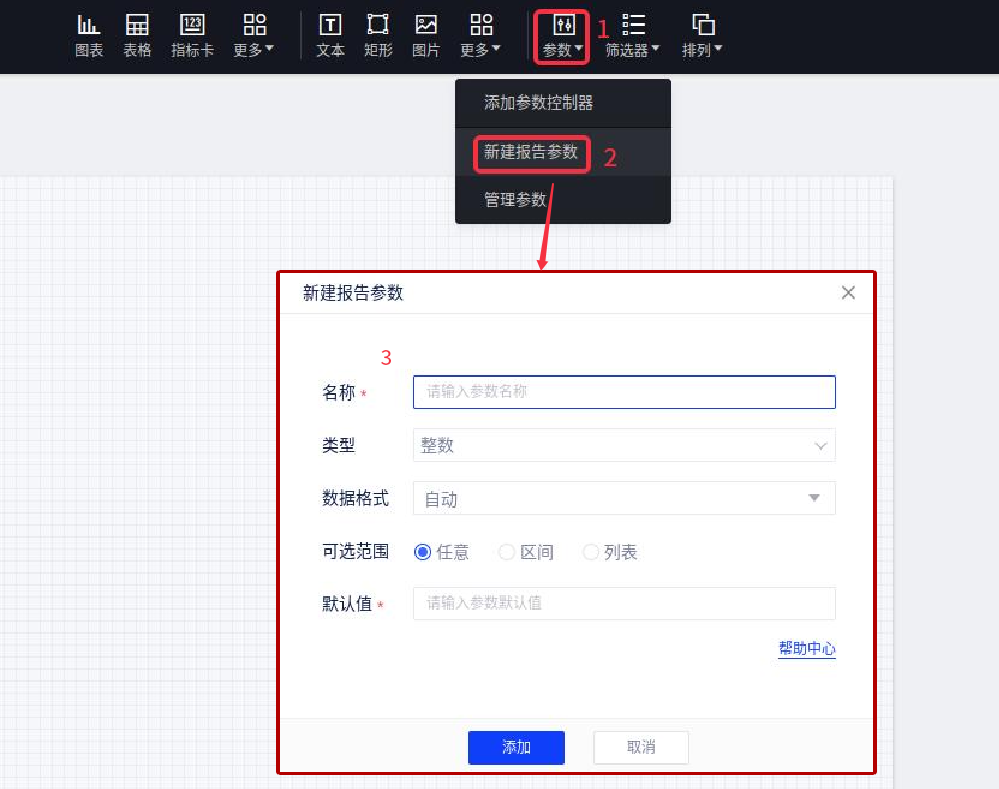 (1)新建一个报告参数,命名为「月销售额」,类型选择「数值」,默认值为0,点击「确定」新建参数完成;