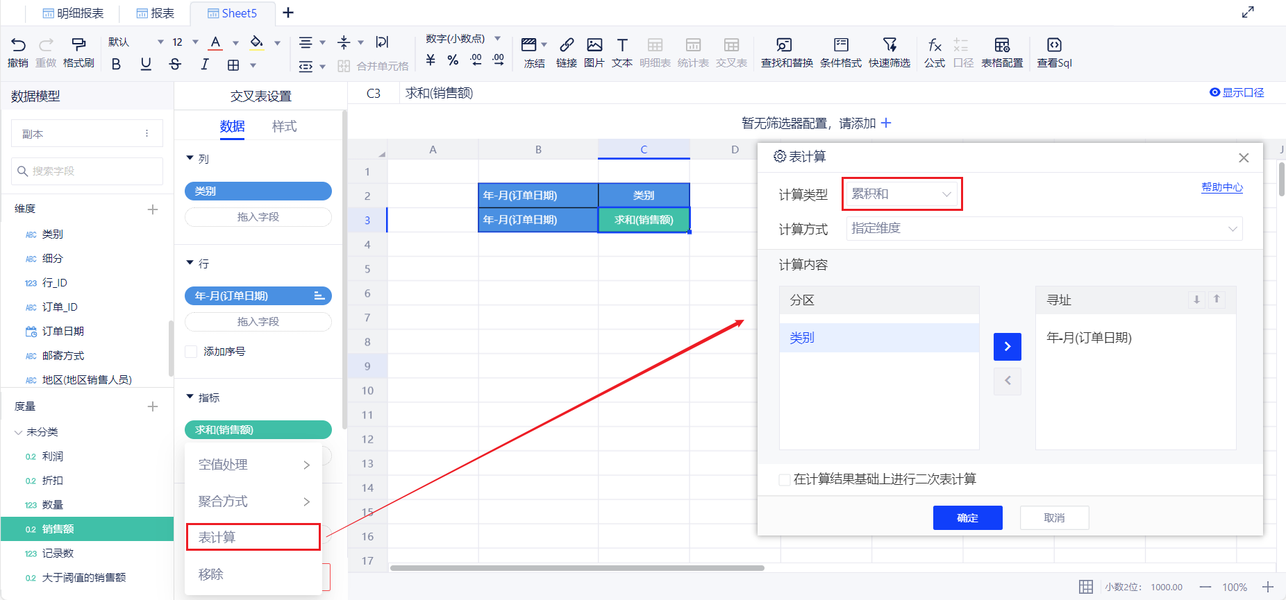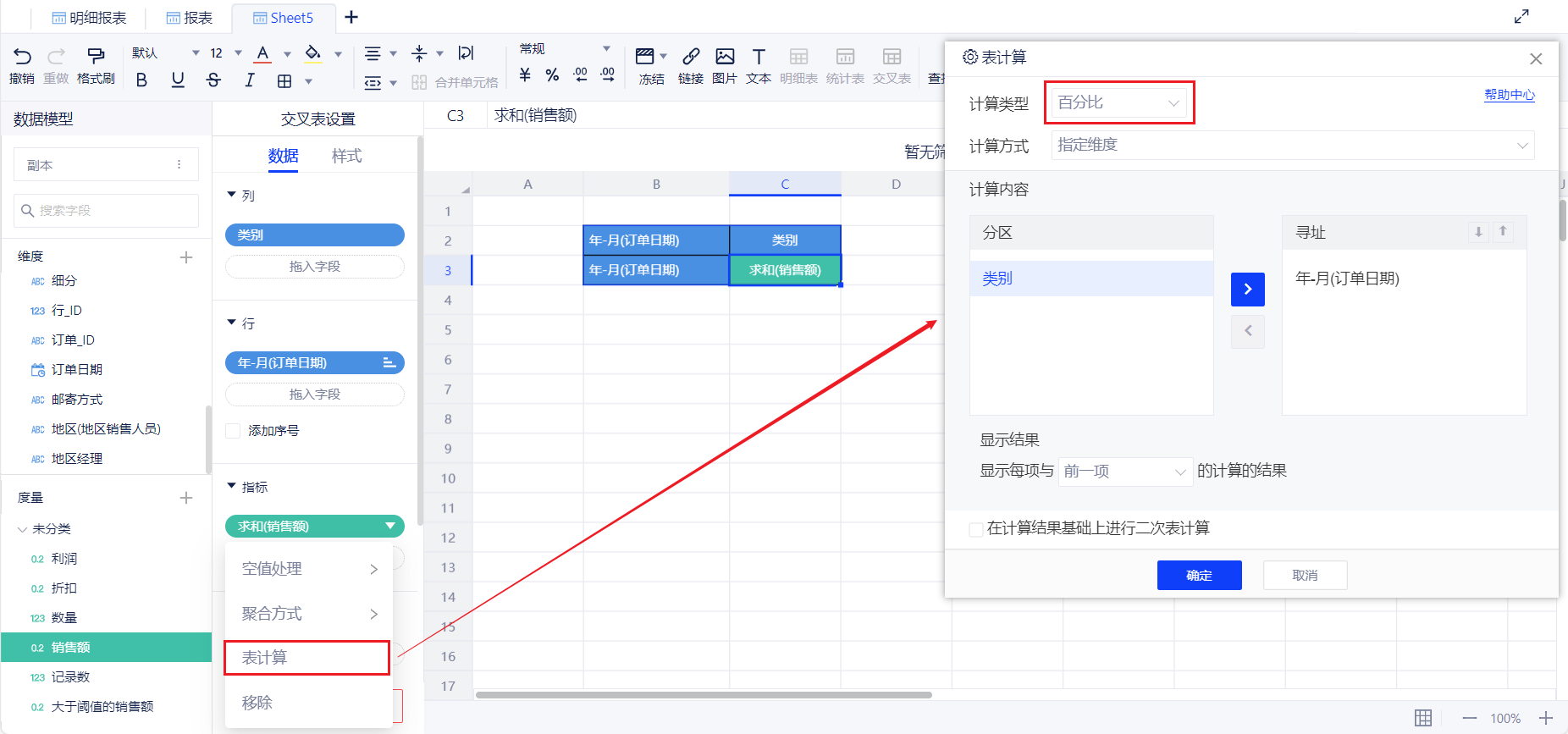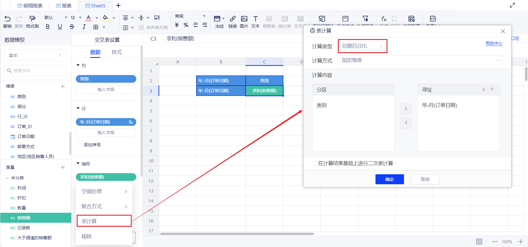 - 在明细表或交叉表配置区鼠标右键单击度量 --> 表计算。