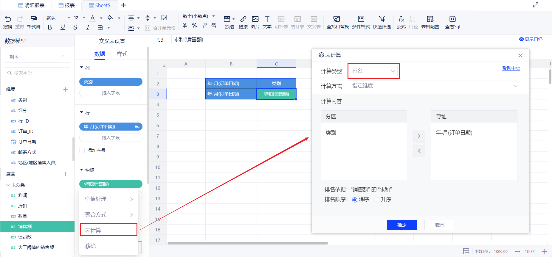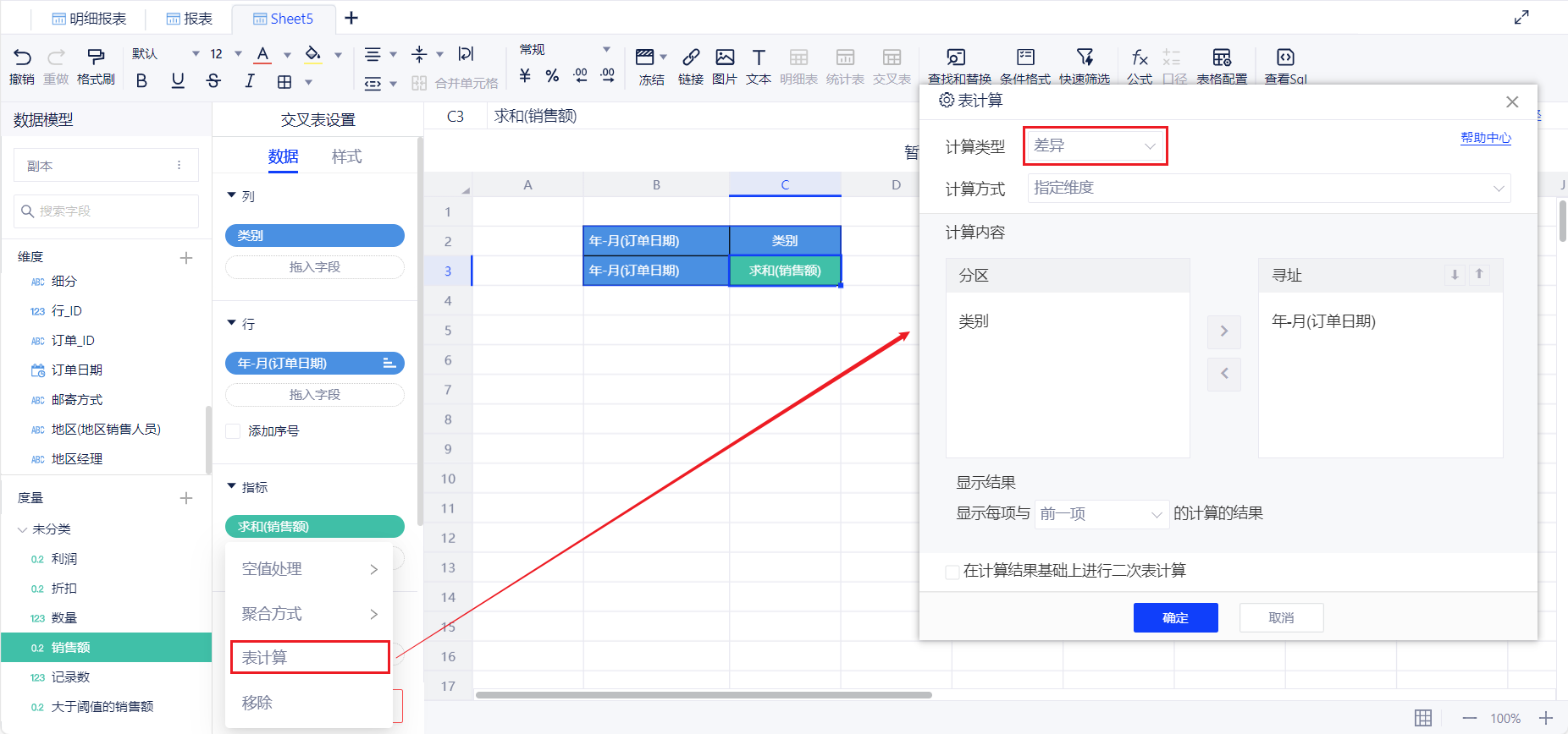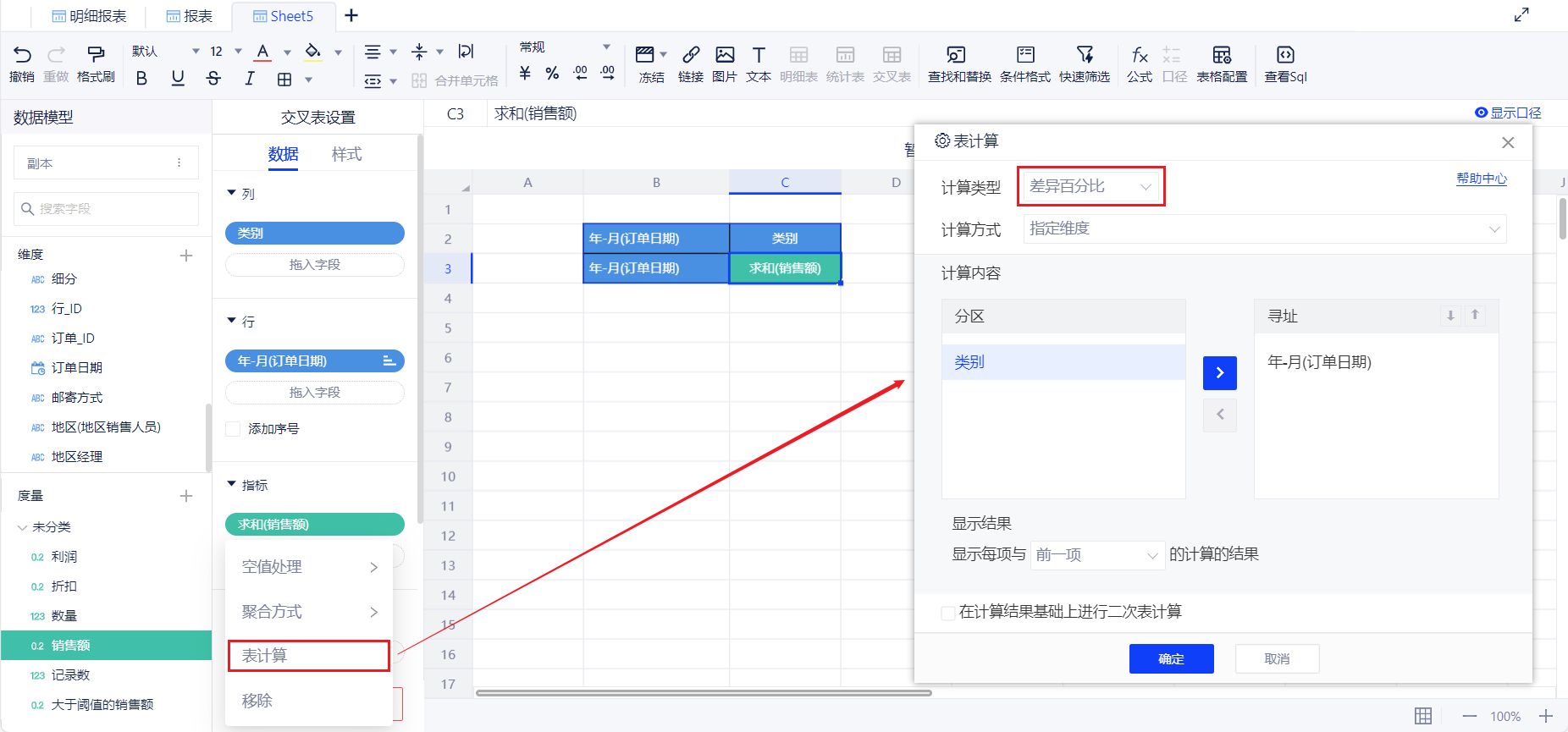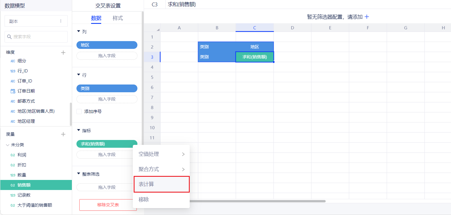 - 在明细表或交叉表配置区鼠标右键单击度量 --> 表计算。