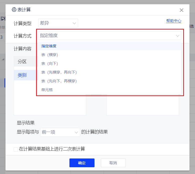 计算方式包括指定维度、表(横穿)、表(向下)、表(先横穿再向下)、表(先向下再横穿)以及单元格。