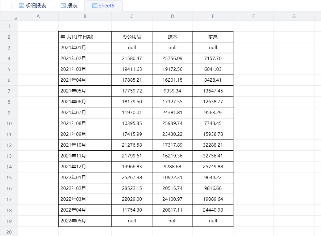 将“类别”设置为分区,“订单日期”设置为寻址,计算结果的聚合方式为平均,前后各一项,包含当前项且若没有足够的项则留空,其结果为根据类别划为三个分组,每个分组按月份计算与之前一月、当前月、之后一月的平均值,如下图所示。