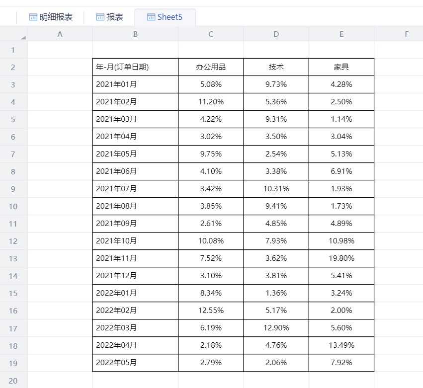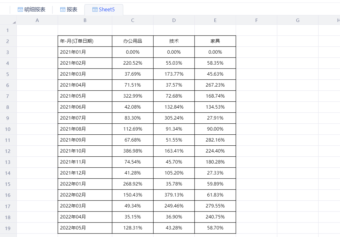 将“类别”设置为分区,“订单日期”设置为寻址,其结果为根据类别划为三个分组,每个分组按月份计算与前一项的百分比,如下图所示。
