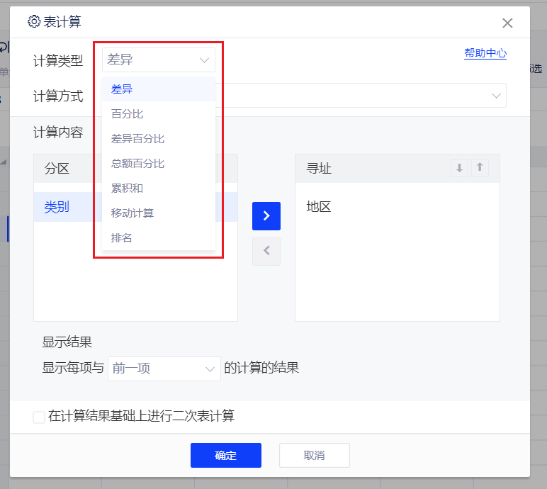 计算类型包括差异、百分比、差异百分比、总额百分比、累计和、移动计算以及排名。
