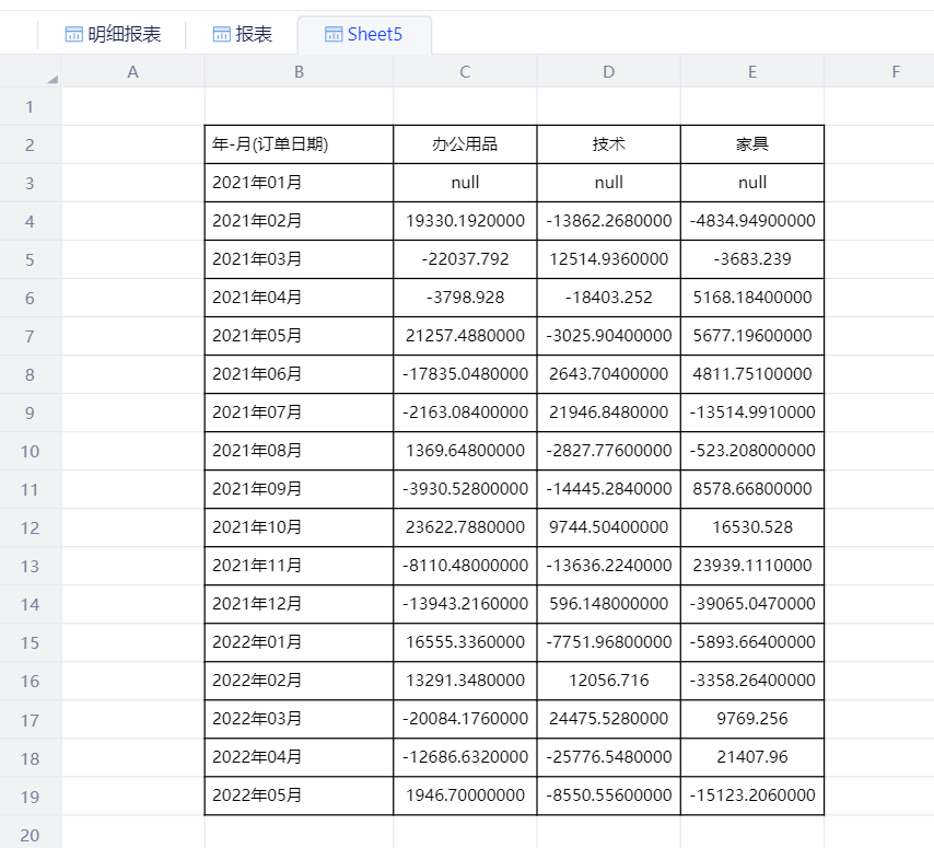将“类别”设置为分区,“订单日期”设置为寻址,其结果为根据类别划为三个分组,每个分组按月份计算与前一项的差异,如下图所示。