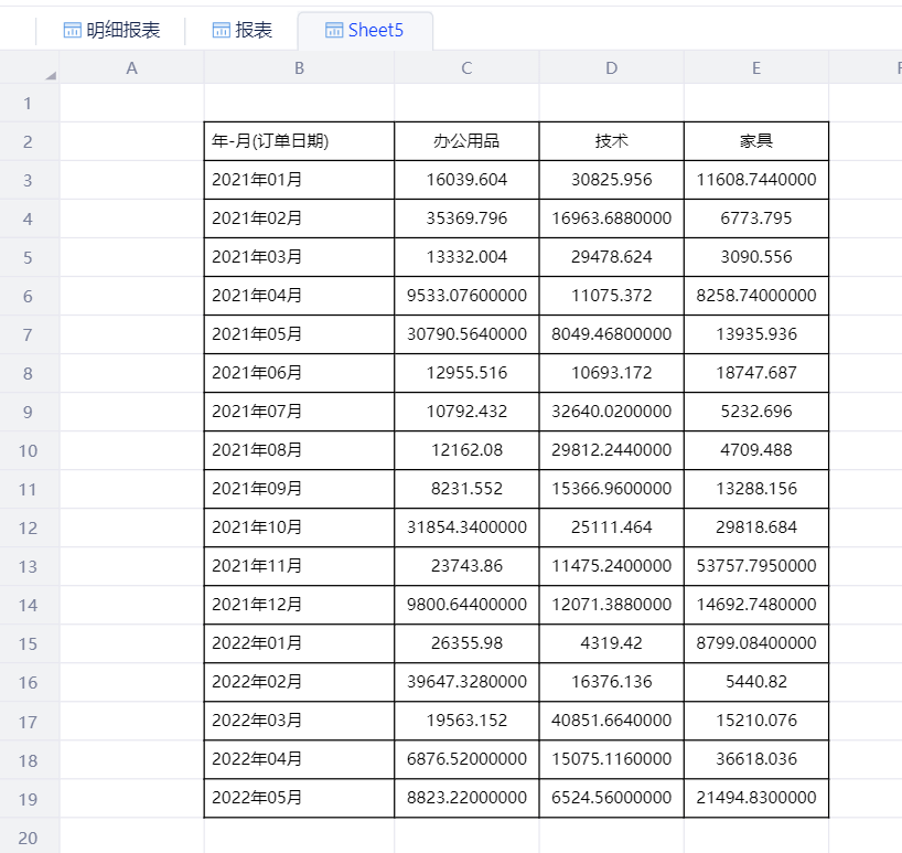 将“类别”设置为分区,“订单日期”设置为寻址,其结果为根据类别划为三个分组,每个分组按月份计算与之前所有项的累计,如下图所示。