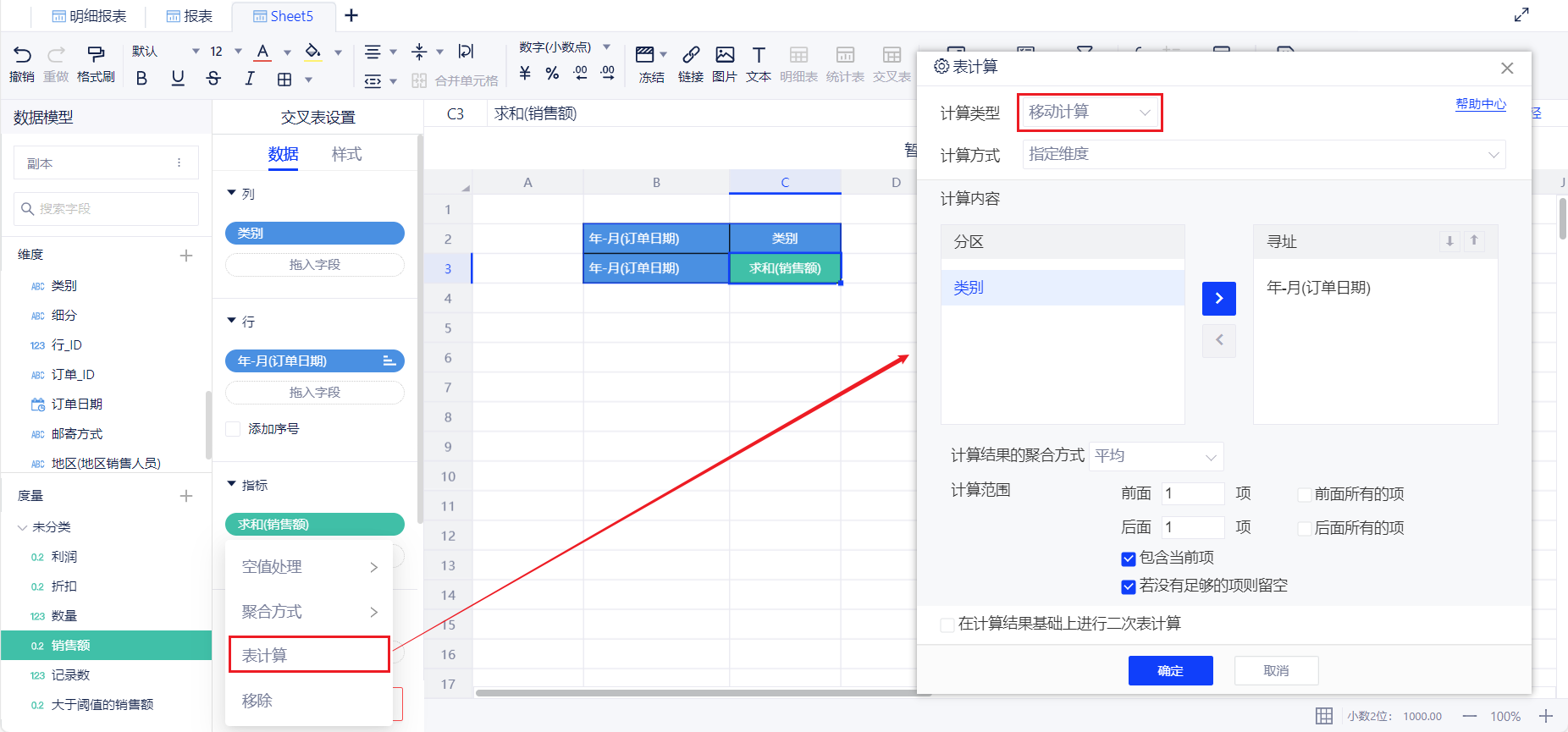 移动计算是表计算的一种类型,它计算的是分组中某一项与其前后几项的聚合计算的结果(求和、平均、最大值、最小值)。