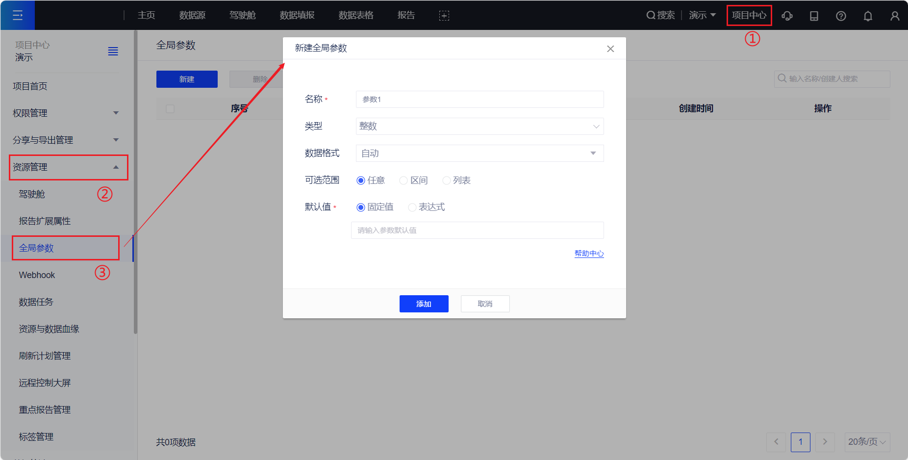 - 项目中心 --> 资源管理 --> 全局参数。