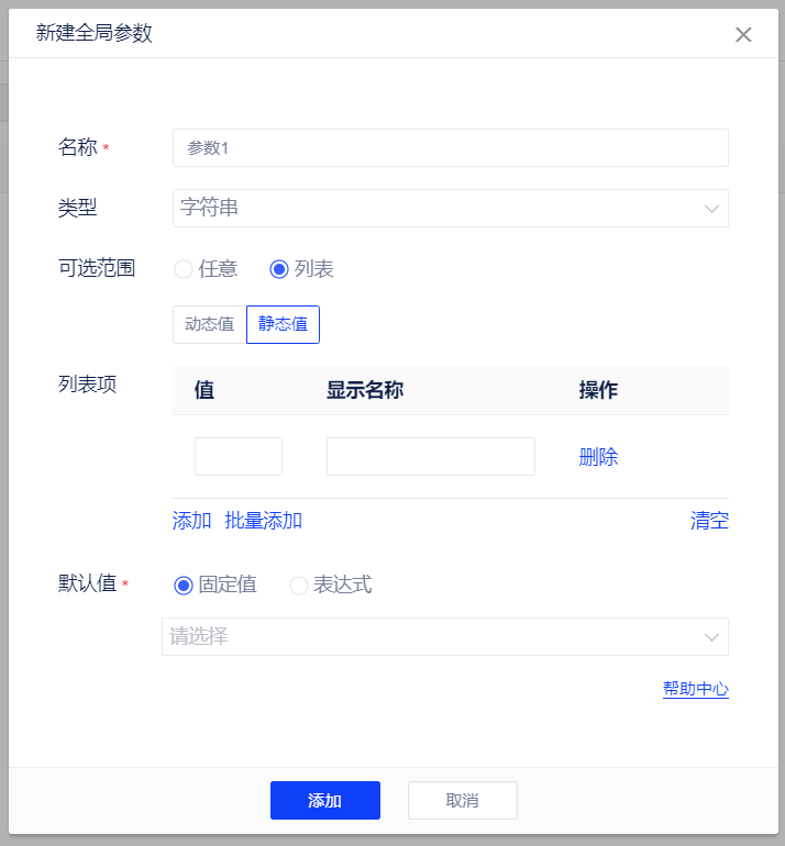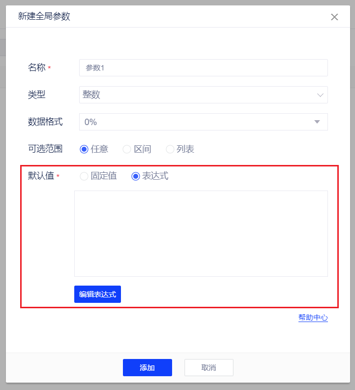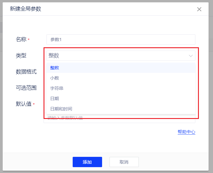 - 在新建字段中点击插入参数可插入全局参数。