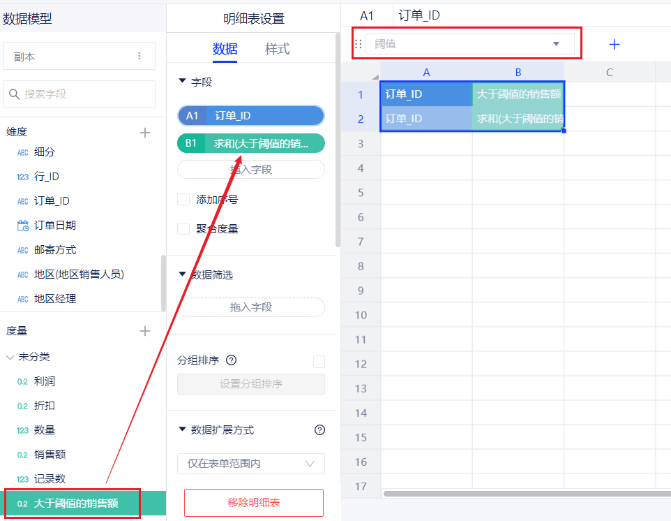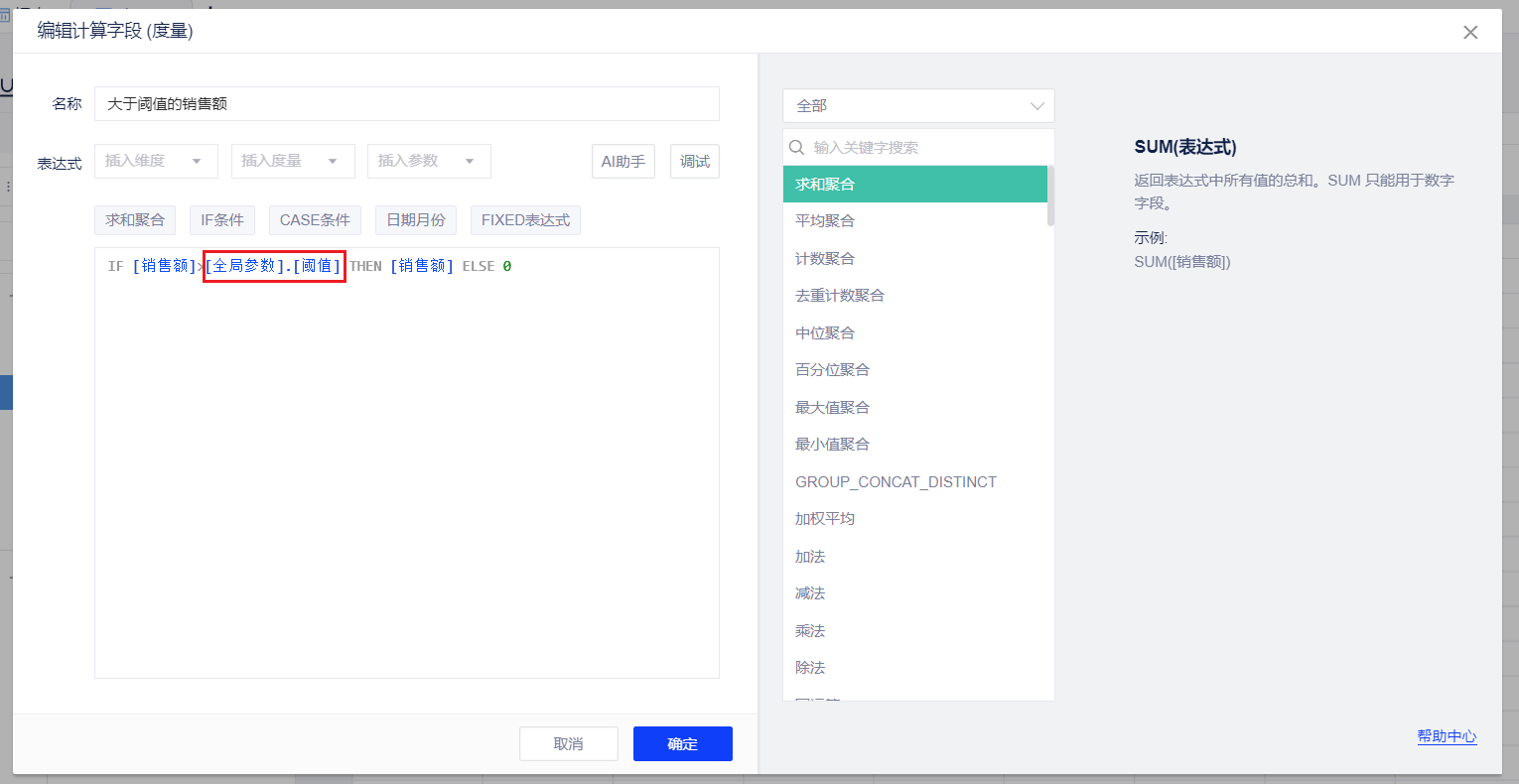 - 在数据表格中,可以计算字段中调用全局参数,此处以一个默认值为500,名称为“阈值”的整数型全局参数为例。