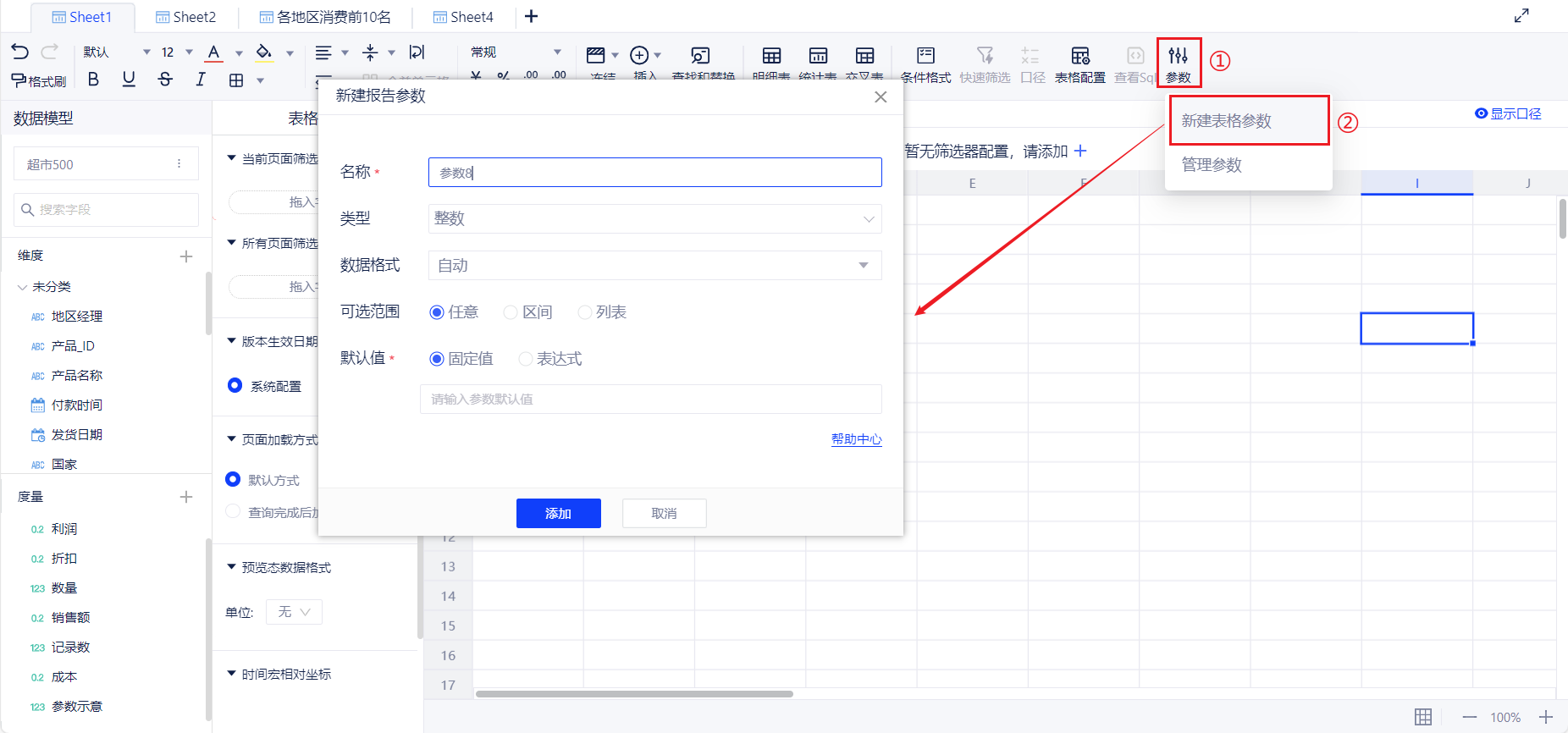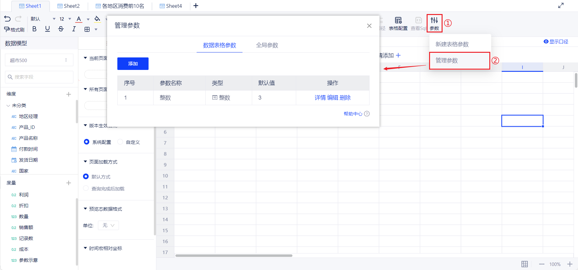参数也叫做变量,可以在计算字段中使用,实现单个计算字段的动态逻辑方案。当参数取不同的值,字段表达式会对应不同的计算逻辑。参数包括全局参数以及表格参数,全局参数可在所有位置调用,表格参数仅可在对应的数据表格中调用。