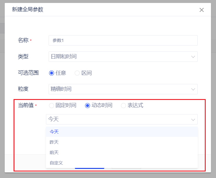 当前值:对于日期以及日期和时间可配置当前值,可以是固定时间、动态时间以及表达式。