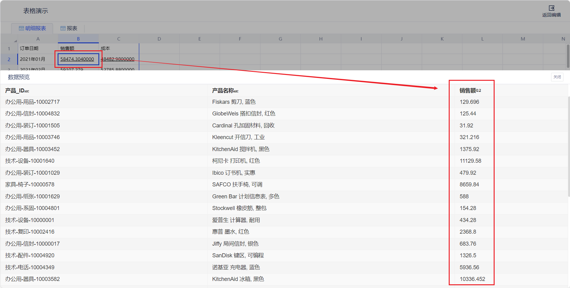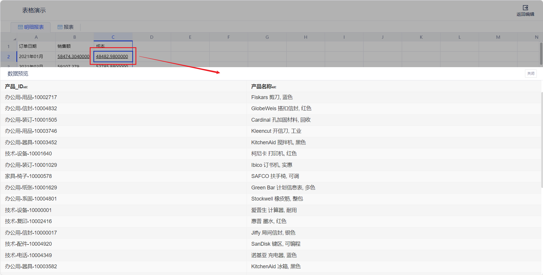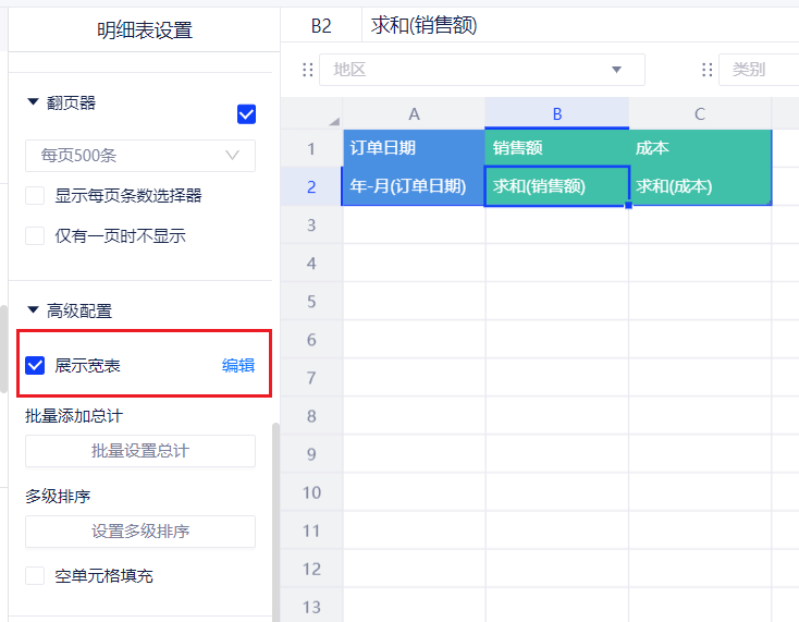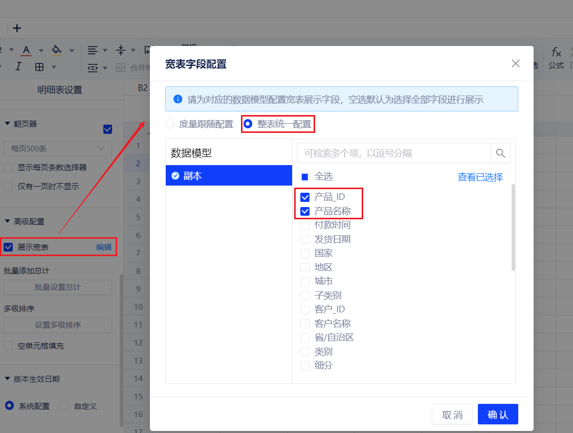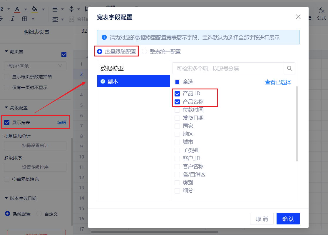 1. 概述2. 快速入门1. 概述用户在查看汇总数据时,可以进一步下钻到对应模型的明细数据。点击对应的指标单元格,产品将会展示当前筛选条件下的明细数据。 2. 快速入门(1) 产品入口 明细表、统计表设置 --> 高级配置 --> 展示宽表。 (2) 编辑宽表:配置对应数据模型的可见字段 支持度量跟随配置。 ① 显示选择可见的字段及展开宽表时点击的度量。 ② 阅览态:点击该字段,查看明细数据。 支持整表统一配置。 ① 可选择整个数据模型包含的字段,仅显示选中的字段。 ② 阅览态:点击该字段,查看明细数据。