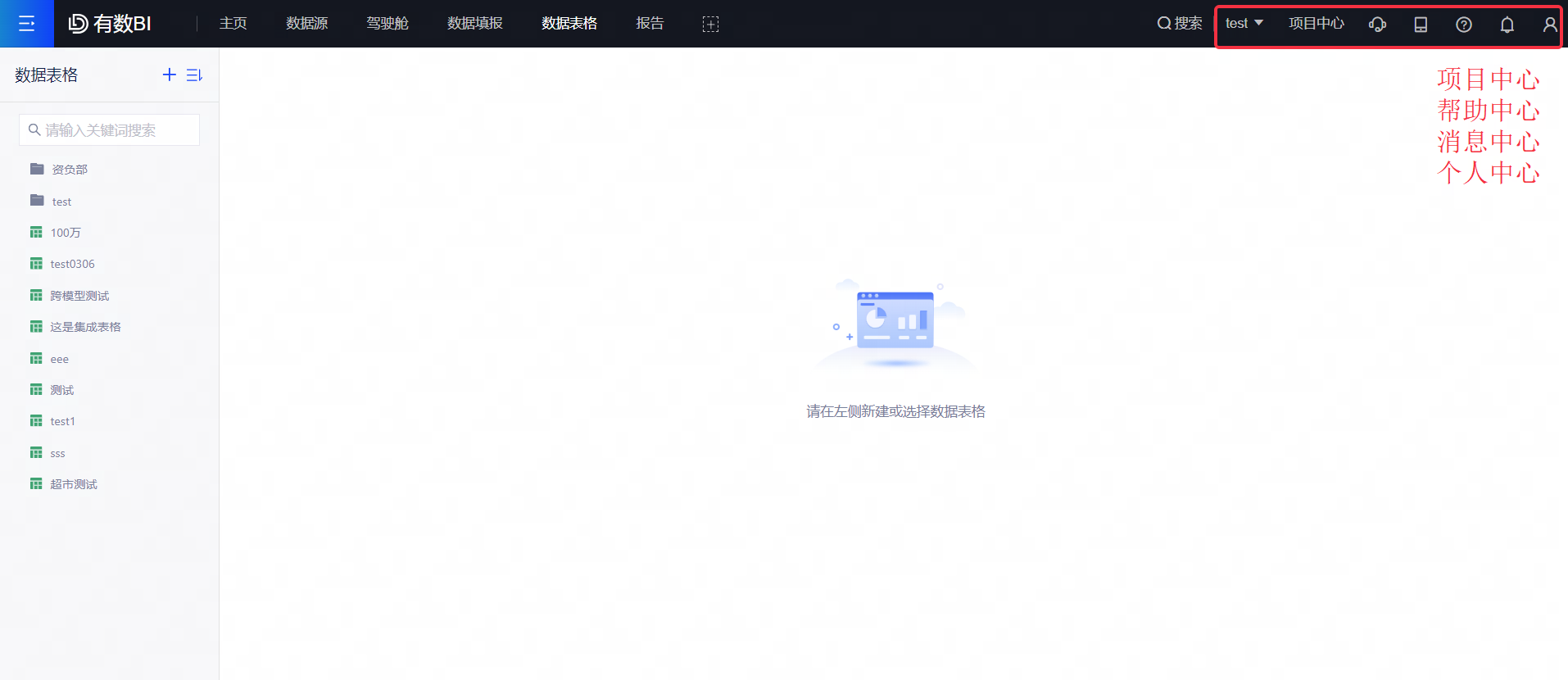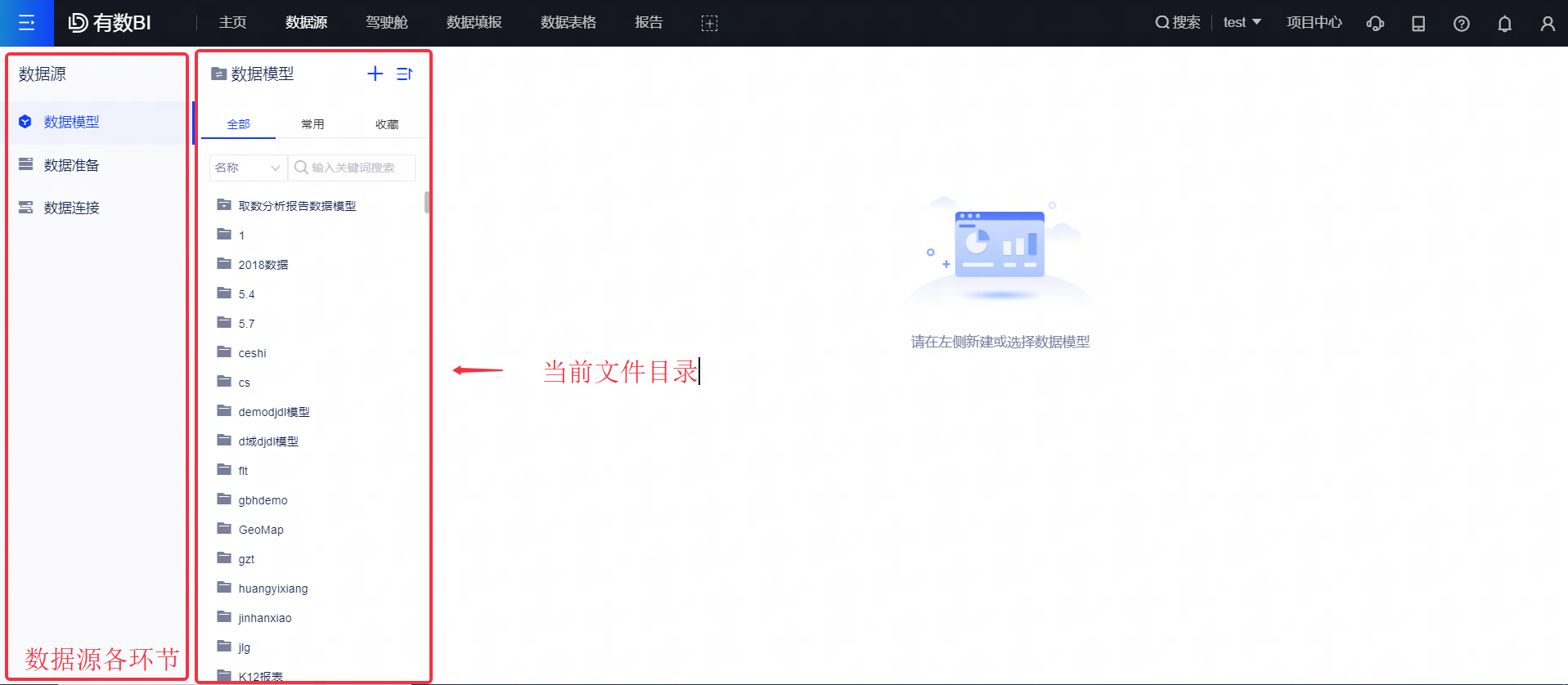 2.数据源:在建立数据分析报告前,您需要在“数据源”模块建立数据连接,将数据(可以是Excel文件,也可以是Mysql、Oracle等数据库,亦或是Hadoop、Spark等数仓平台)接入本产品。同时您需要在“数据源”模块根据分析的目的,选择一个或多个数据表,进行多表关联和数据处理,建立数据模型,之后需要基于数据模型来建立报告。详情请参见数据源。