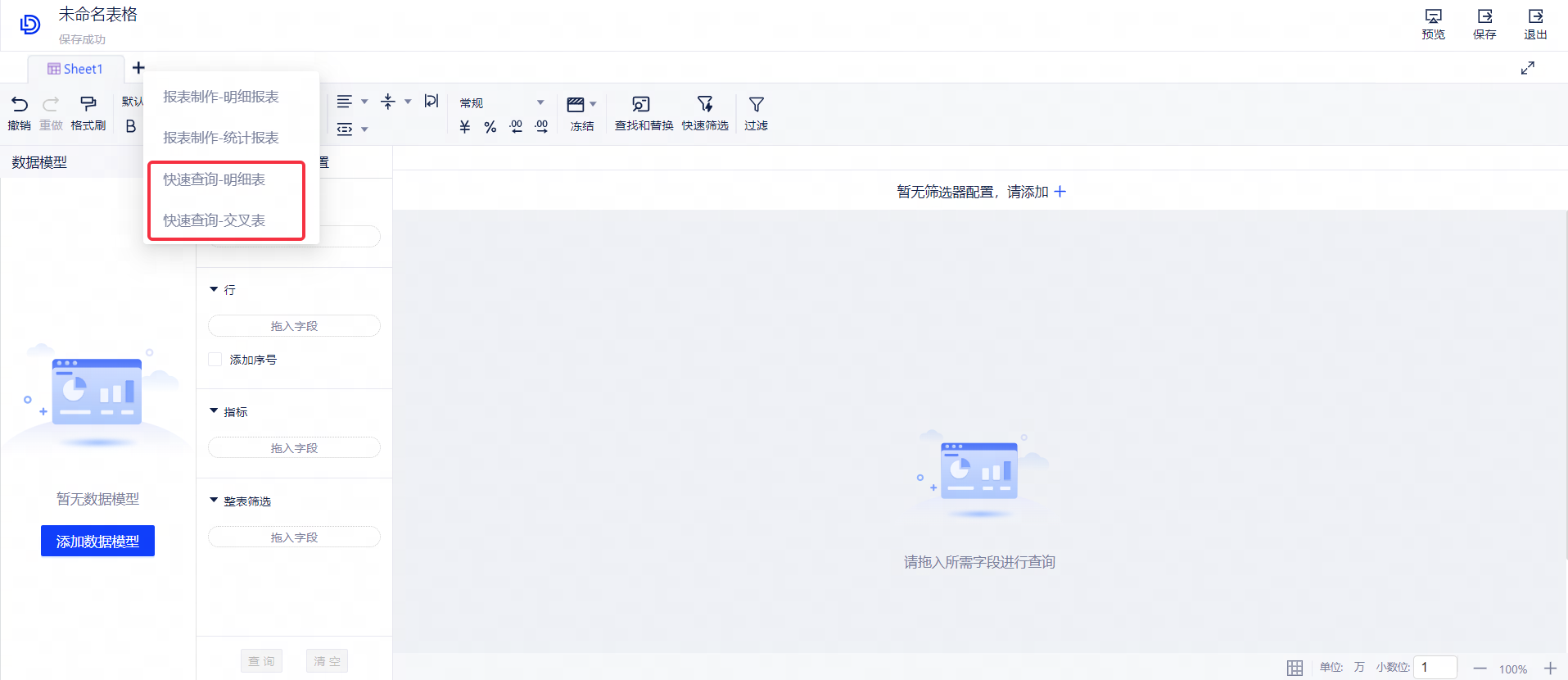 4.快速查询(数据表格):快速获取数据和明细数据,简单拖拽既可完成数据获取,分为明细表和交叉表。