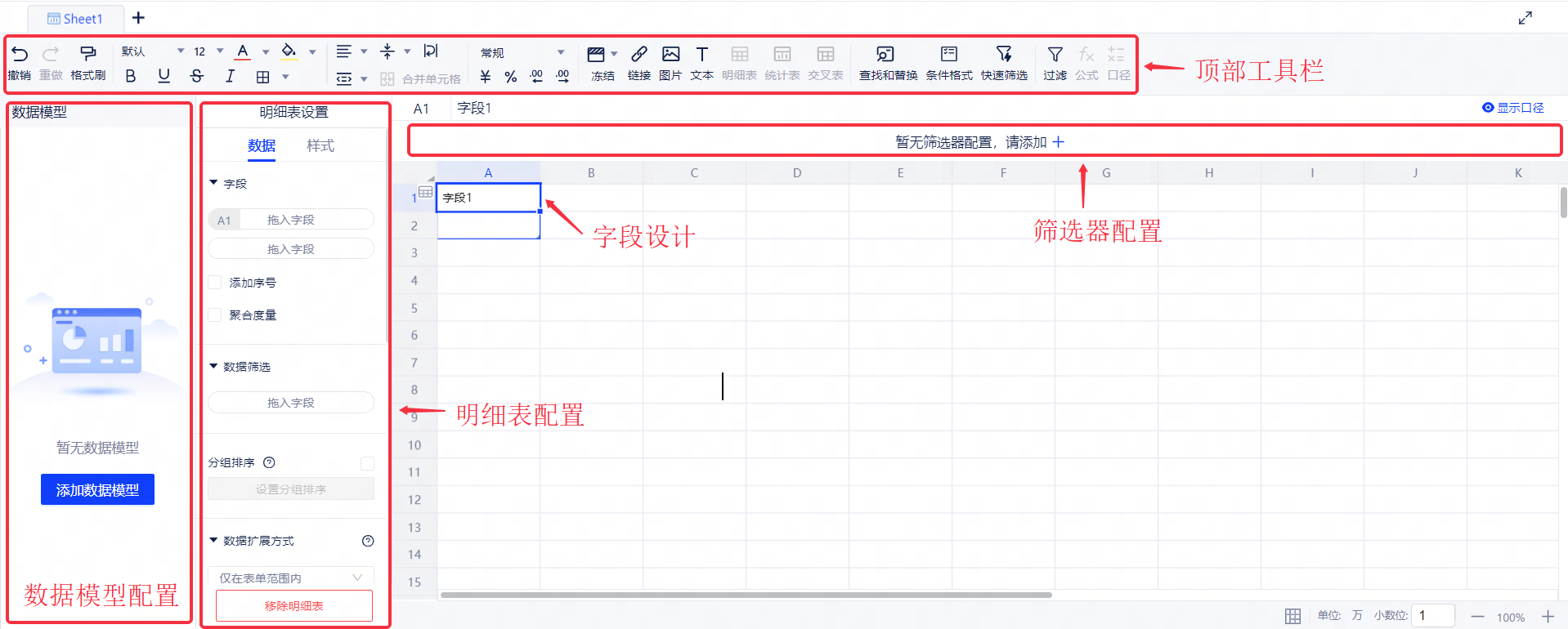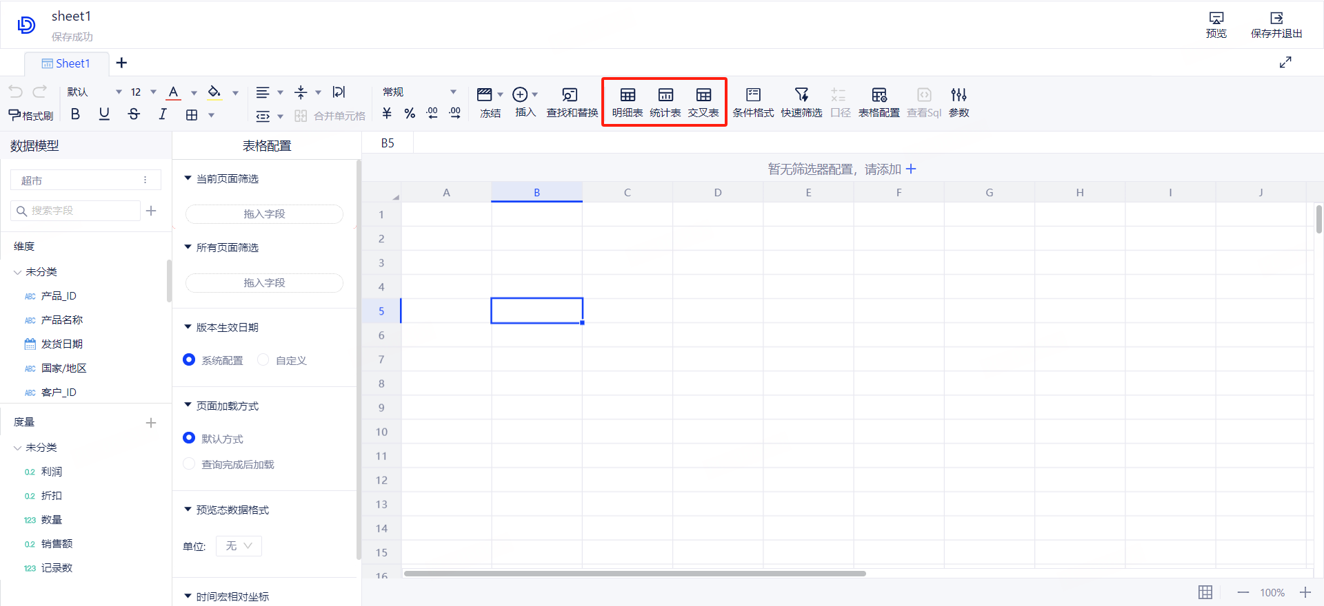 - 明细表:由一行或多行单元格组成,用于显示数字和其他项以便快速引用和分析,您通过简单地配置即可展示出对应的明细数据。同时表格还支持样式配置、条件格式、排序和聚合等操作。