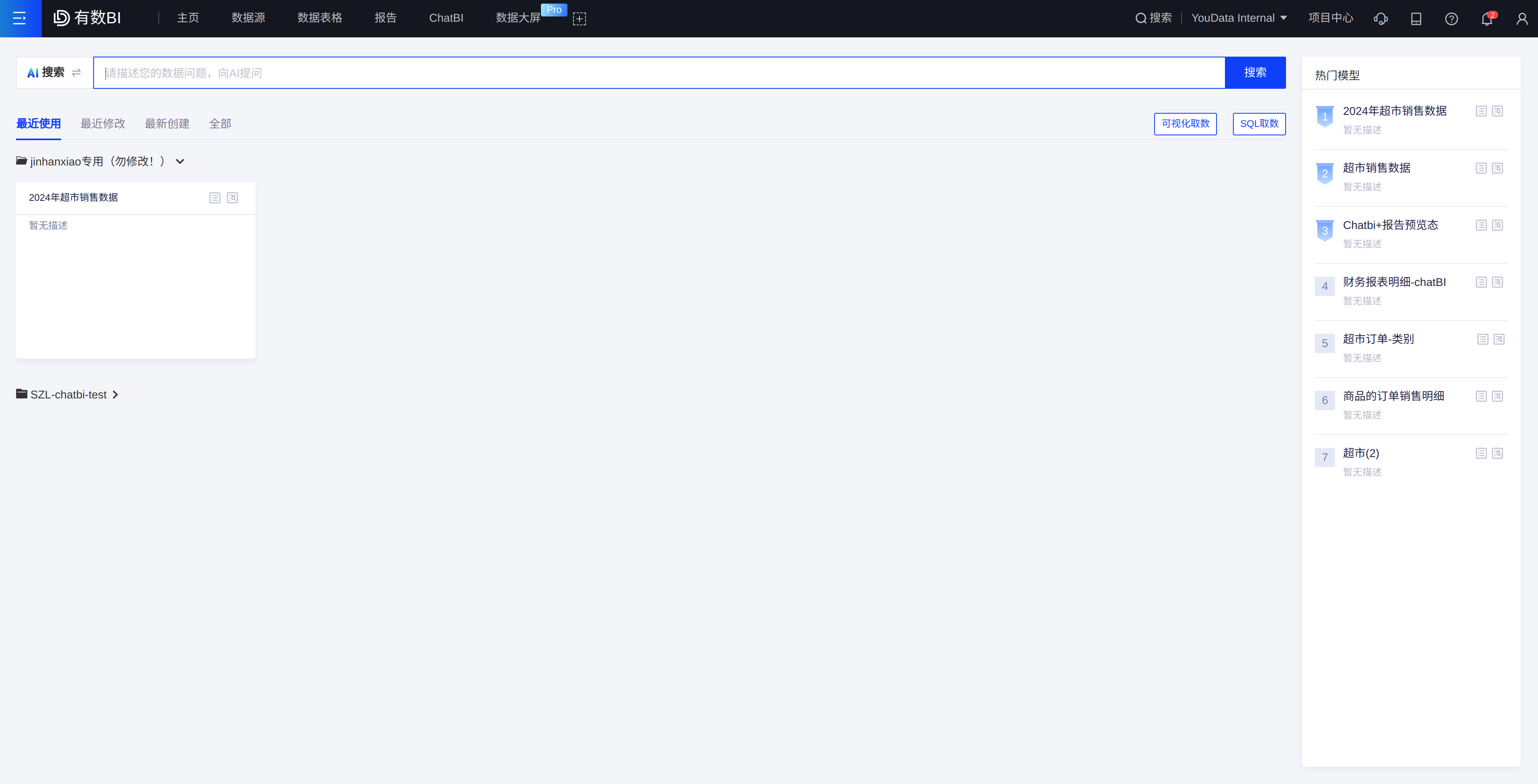 进入可视化取数界面后,顶部有ChatBI的问题输入框(若点击关闭输入框,可点击「AI」按钮重新唤出),您可以用自然语言输入问题,说明您想要查看的数据。