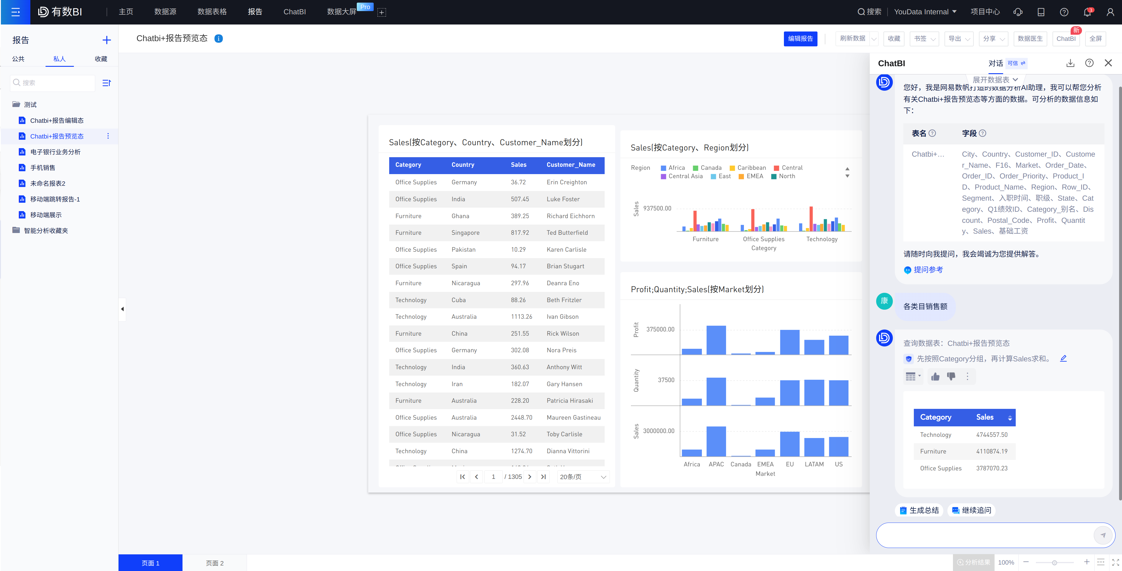 ChatBI 除了有单独的问答界面,帮助您智能分析数据。我们也在有数BI的不同产品模块都以Copilot的形式嵌入了ChatBI的智能问答能力。