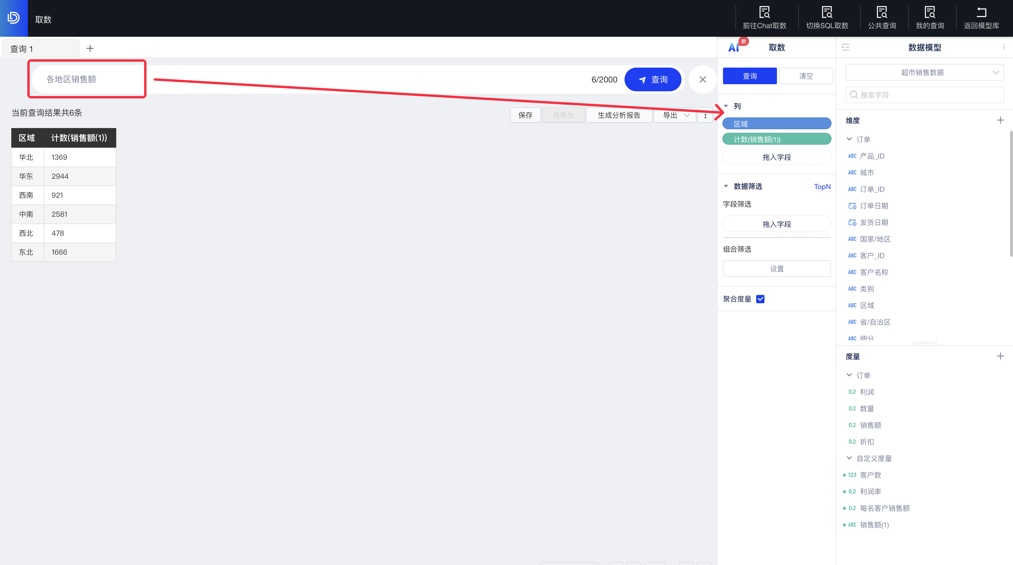 以「超市销售数据」为例,AI帮您自动拖入对应的字段,完成取数面板的配置: