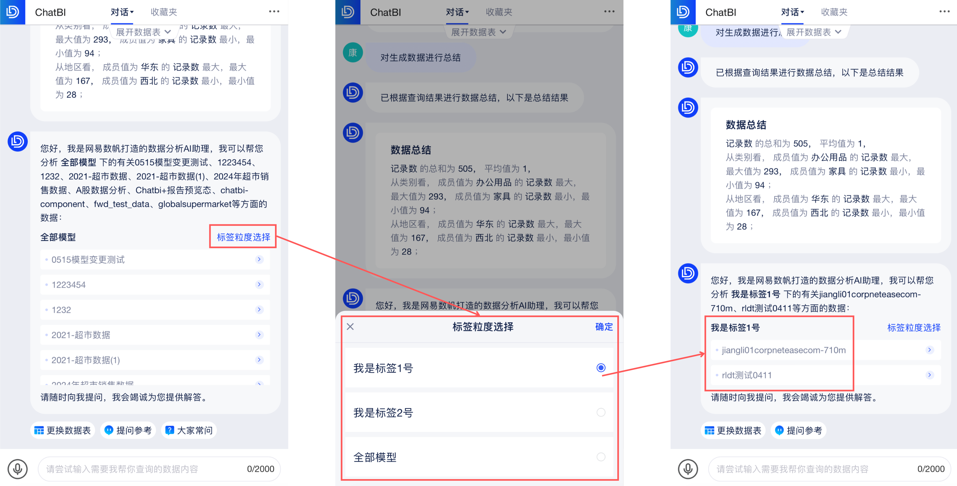 选定标签后,点击「更换数据表」,可选择自己想要查询的数据表,支持多选数据表(若勾选多表后AI问答效果不佳,可尝试减少勾选表格或仅选择单表,有时能给AI问答带来一定准确率的提升)。