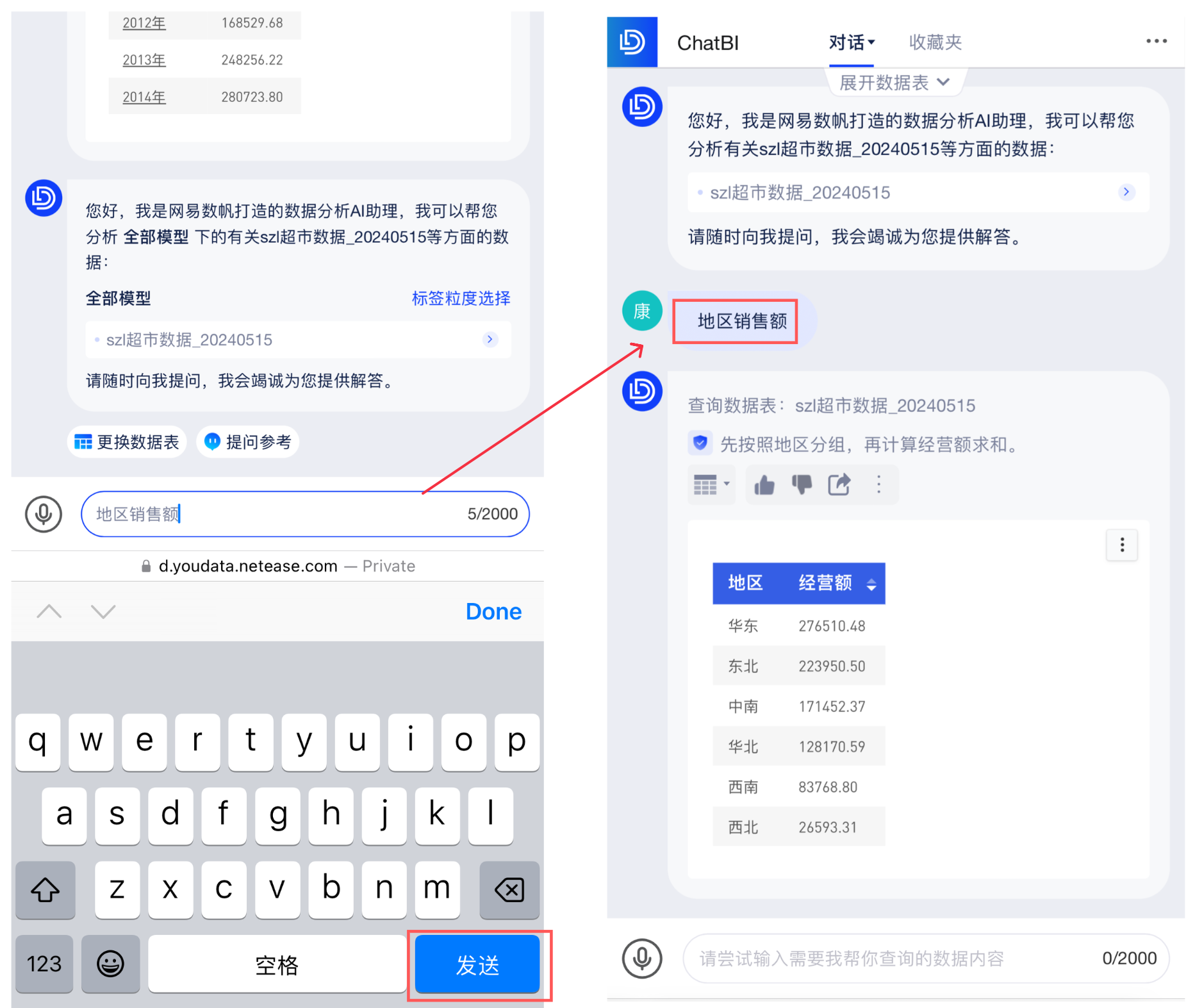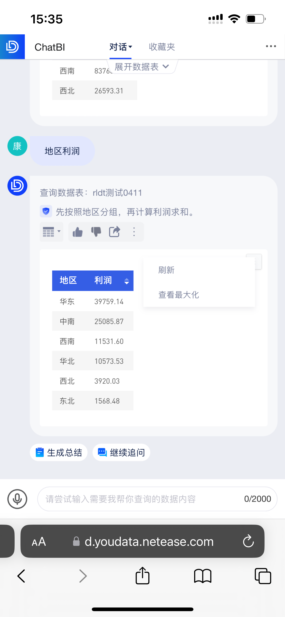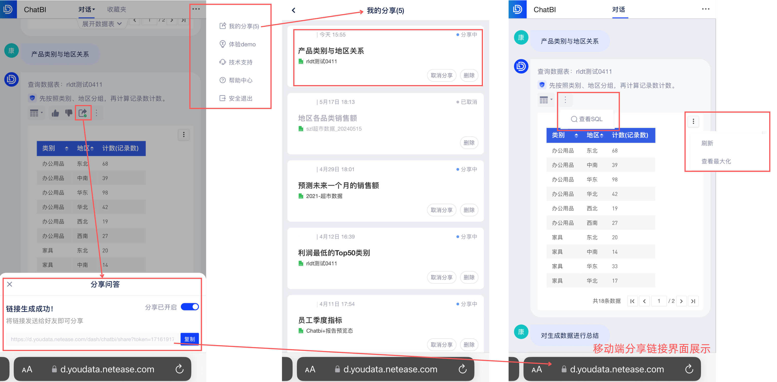 在web端ChatBI界面,通过扫描二维码,可进入移动端。问答支持功能:更换数据表、提问参考、大家常问;界面组件:收藏夹、我的分享。展示如下图: