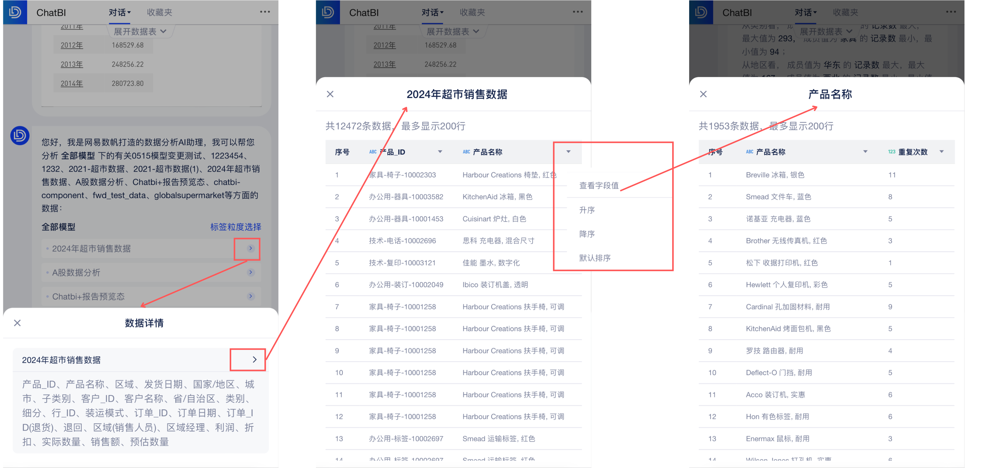 基于ChatBI问答展示的图表,提供自动生成数据总结,通过描述性统计,帮助您快速获取全面且准确的数据概述。例如,当用户查看"产品类别与地区关系"时。