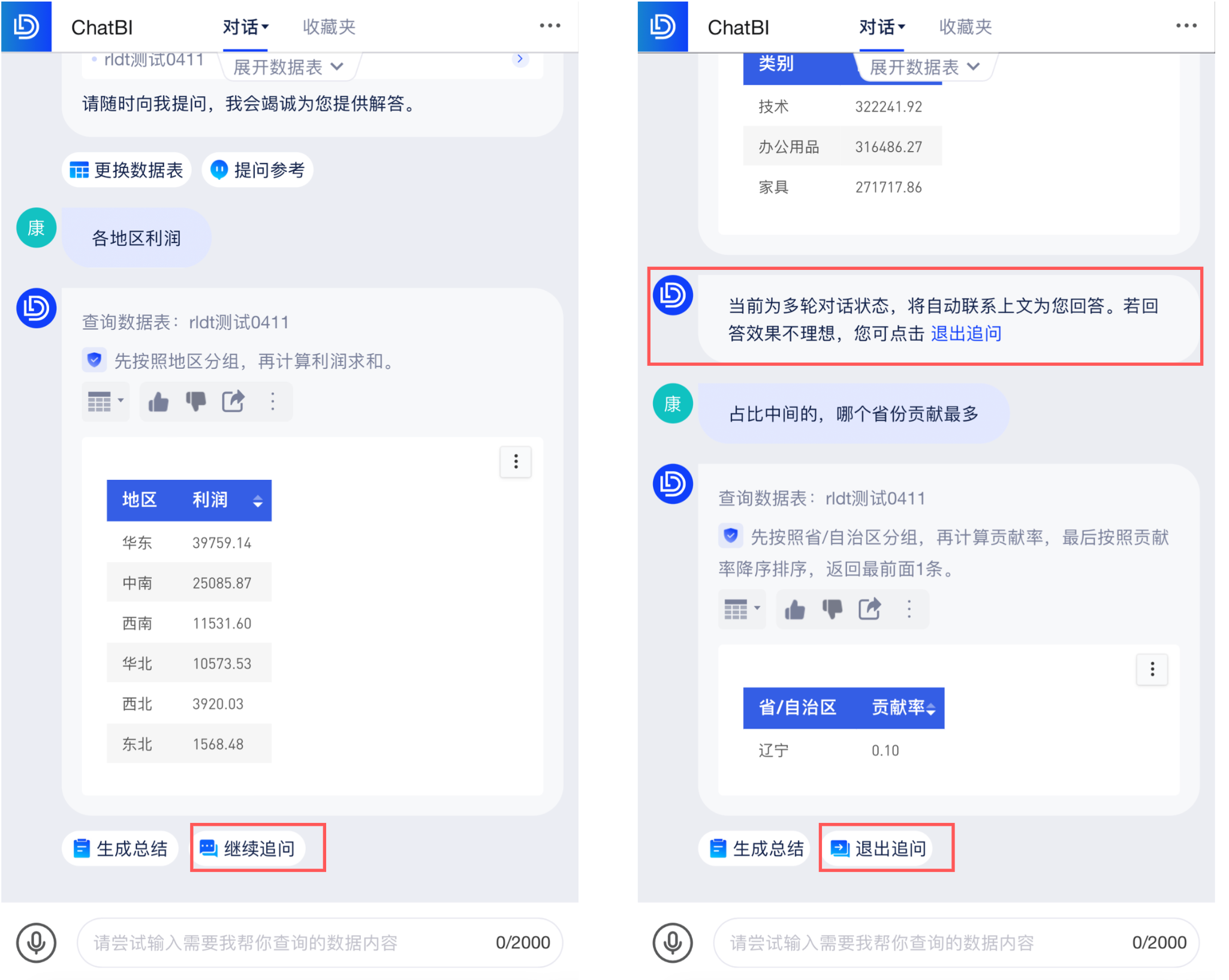(1)点击「继续追问」按钮,则进入多轮对话状态,自动联系上下文内容为您回答。