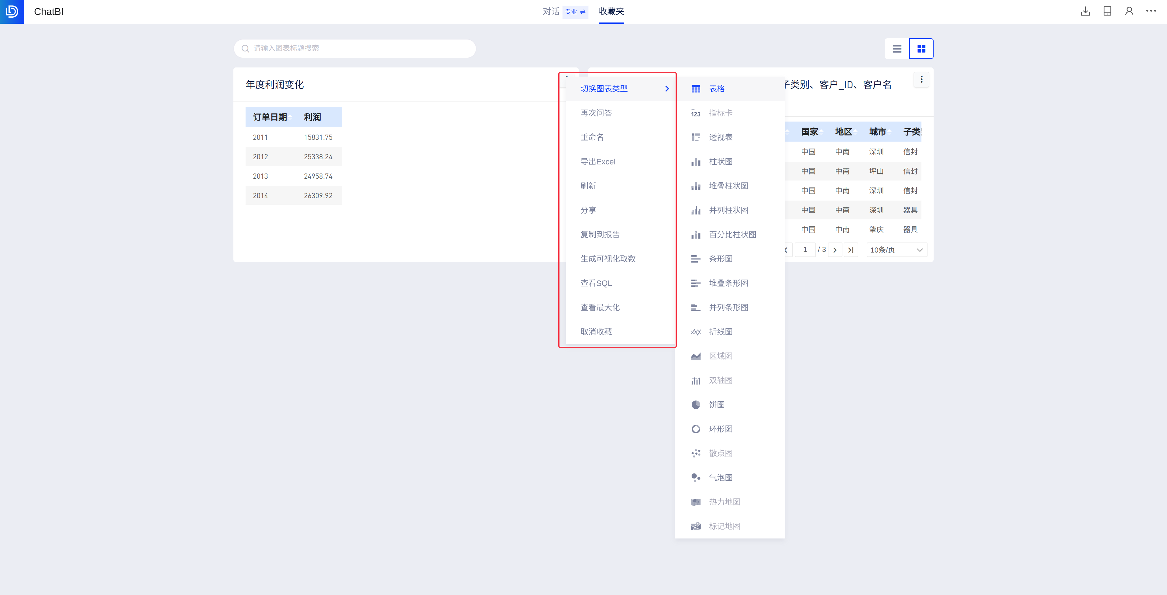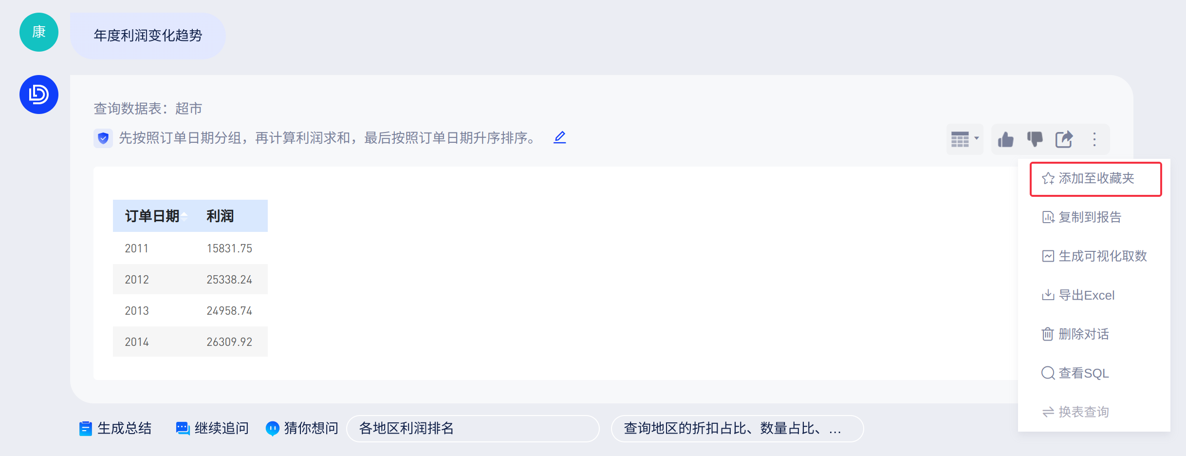 收藏夹内的图标支持操作如下:切换数据类型、再次问答、重命名、导出excel、刷新、分享、复制到报告、生成可视化取数、查看SQL、查看最大化、取消收藏。