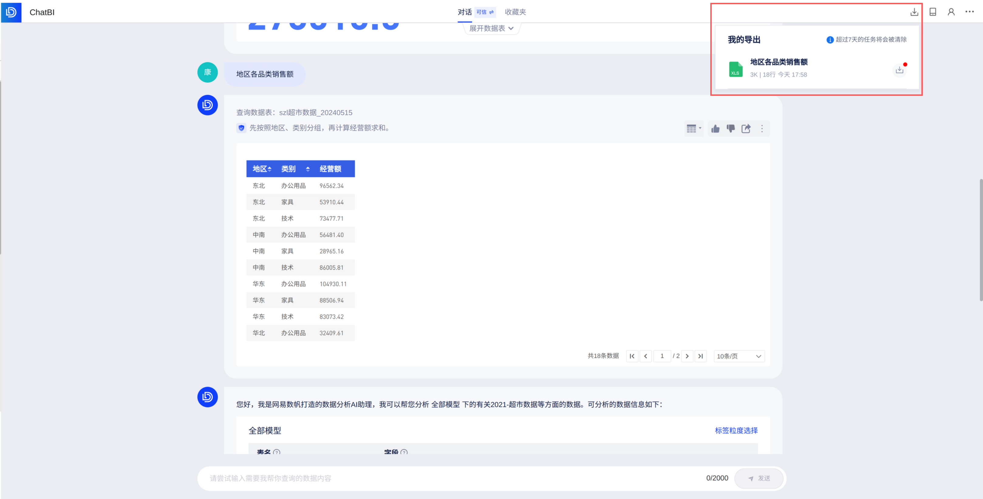 其中点击[再次问答]选项,会打开新ChatBI界面,并展示回答。