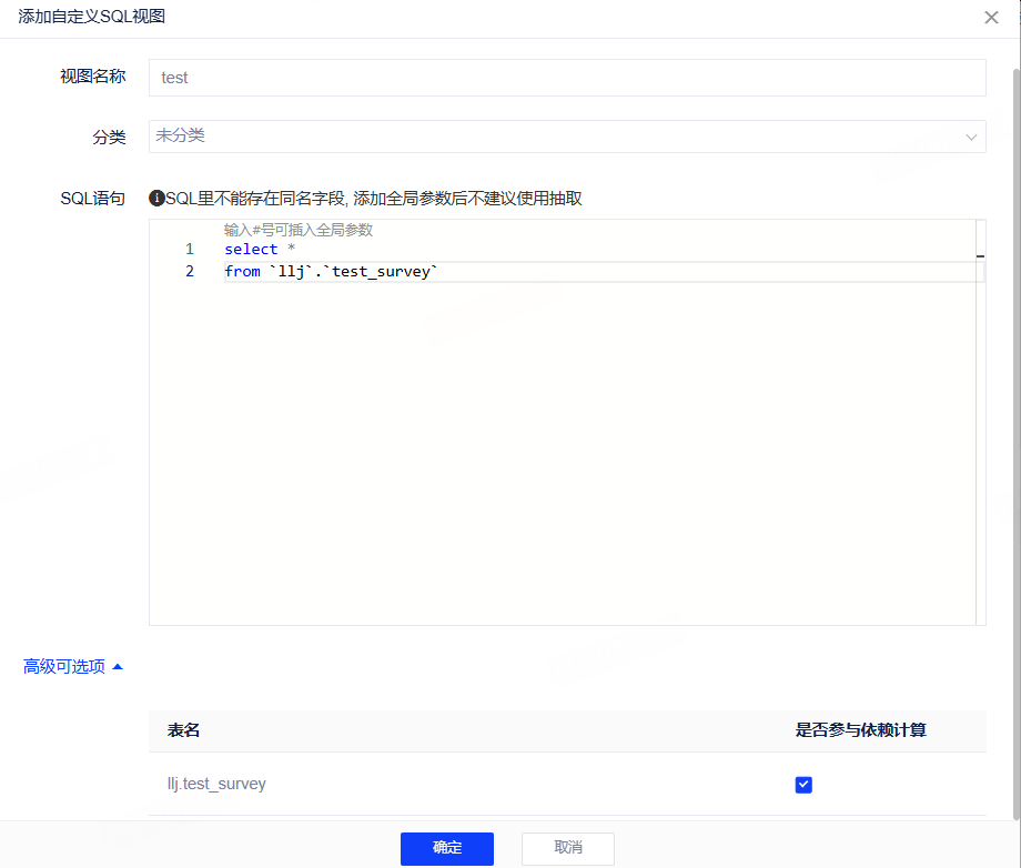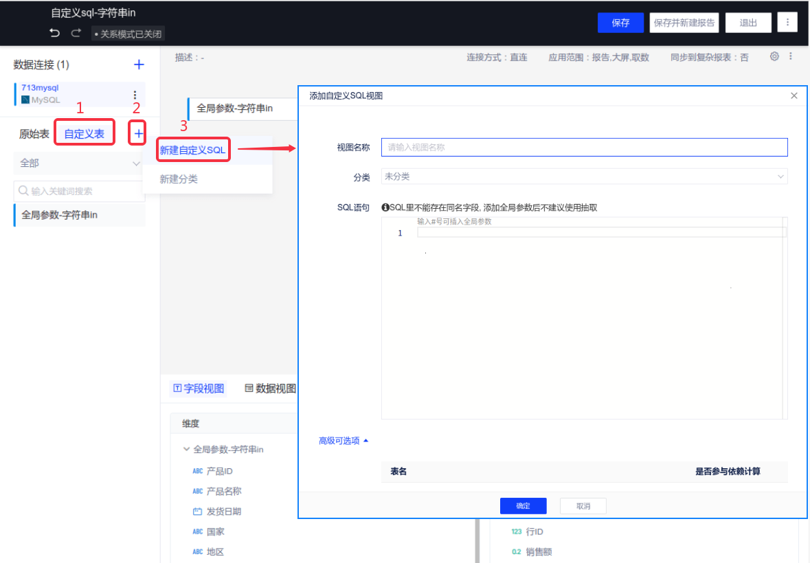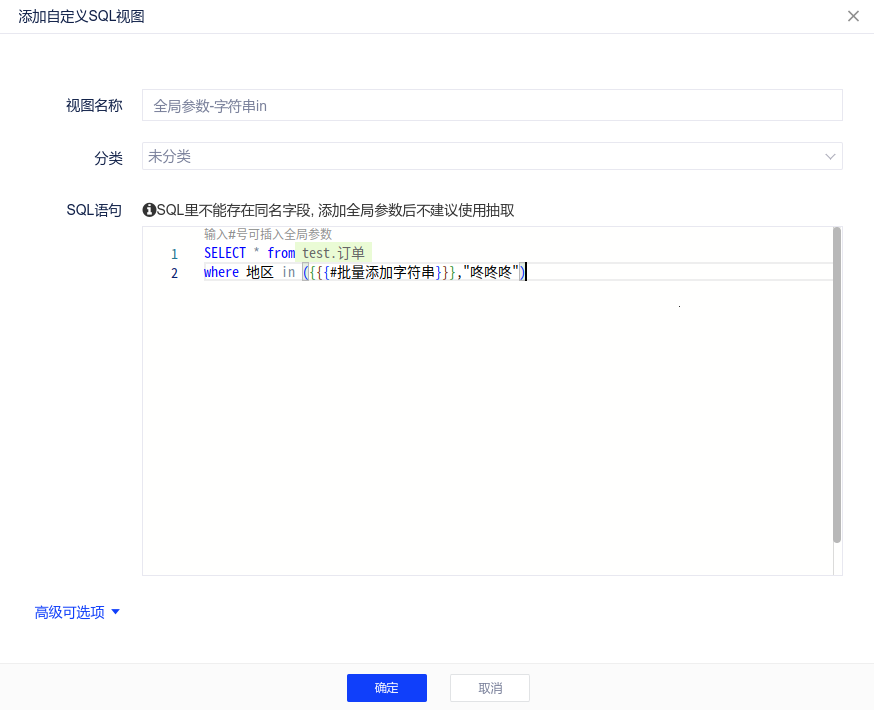 (3)视图名称设置完成后,便可以在下方 SQL 编辑区自行输入 SQL 语句,也可以输入#号插入全局参数;