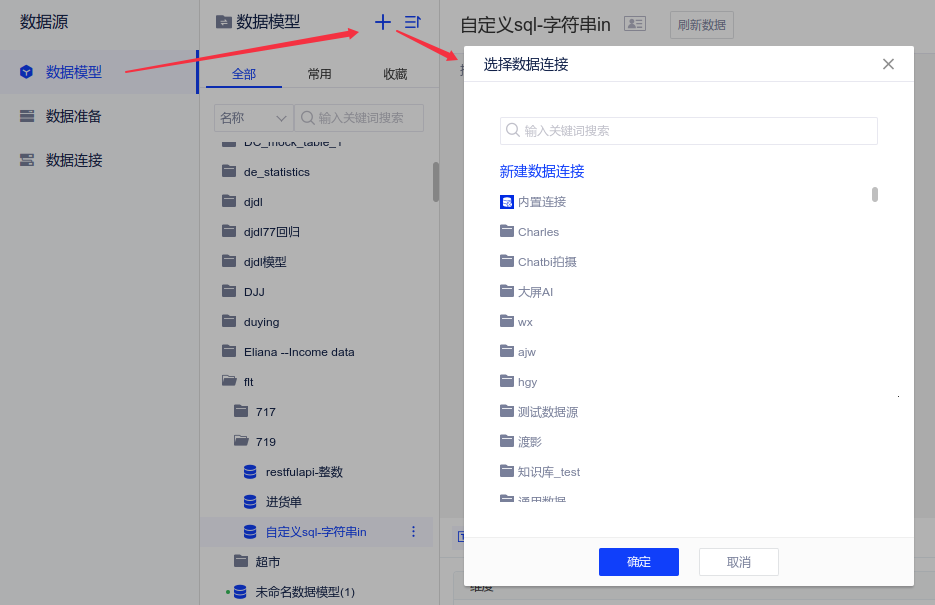 (1)点击 【数据源】-【数据模型】-【新建模型】,从已有数据连接中选择目标数据源,或者直接从头新建数据连接;