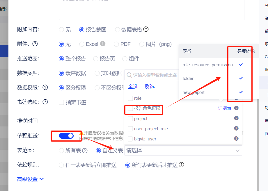 依赖推送:当定时推送开启依赖推送配置。若表数据更新,可调用接口触发推送。