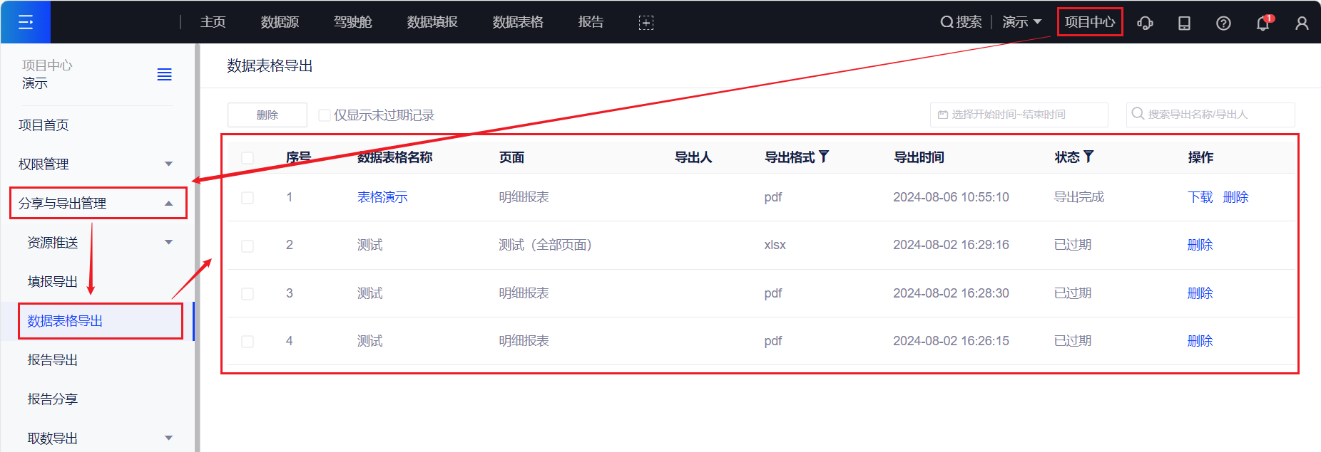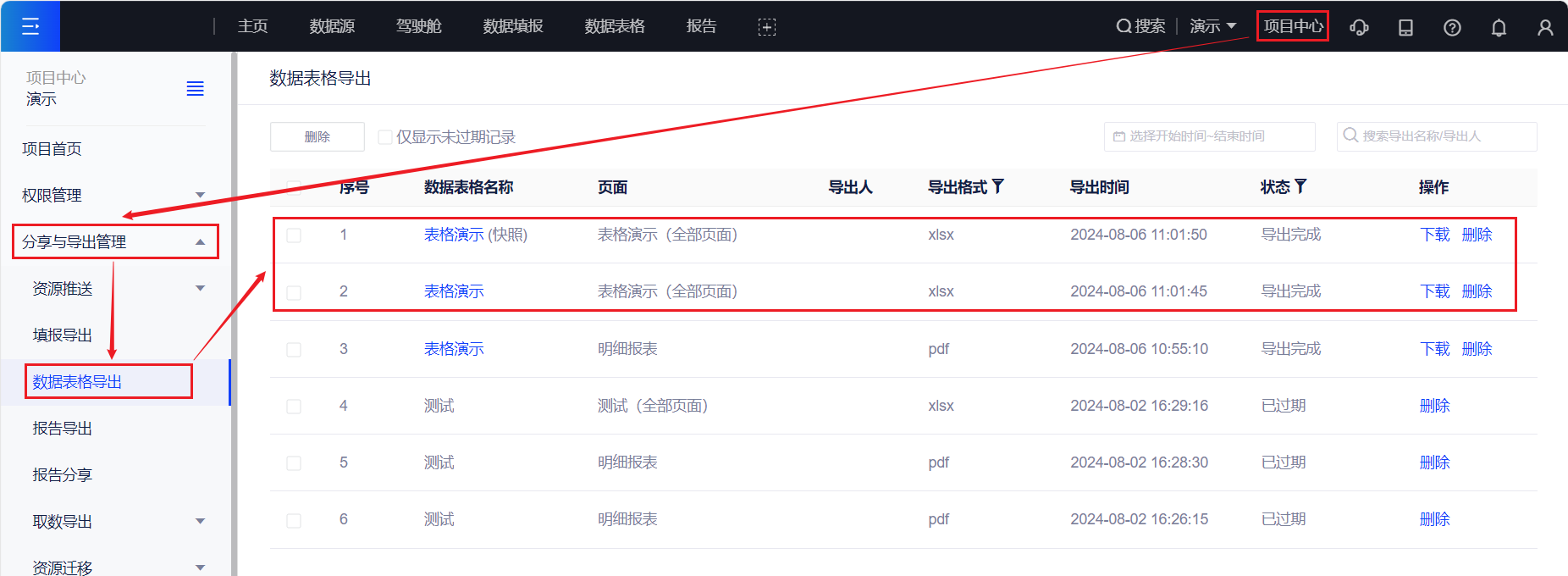 导出后可在项目中心 --> 分享与导出管理 --> 数据表格导出中查看导出状态、下载导出结果或删除导出记录。