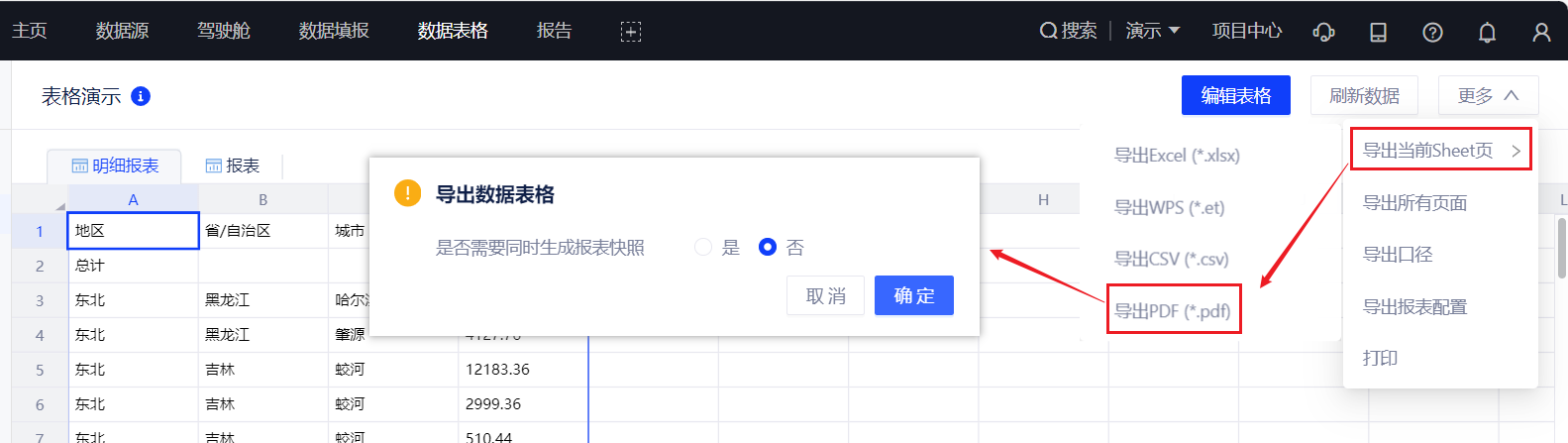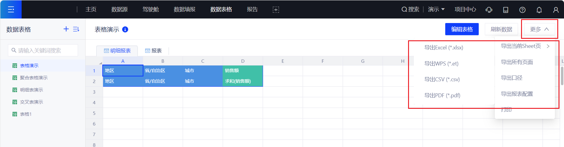 - 支持导出当前sheet页面为Excel、WPS、CSV、PDF格式。