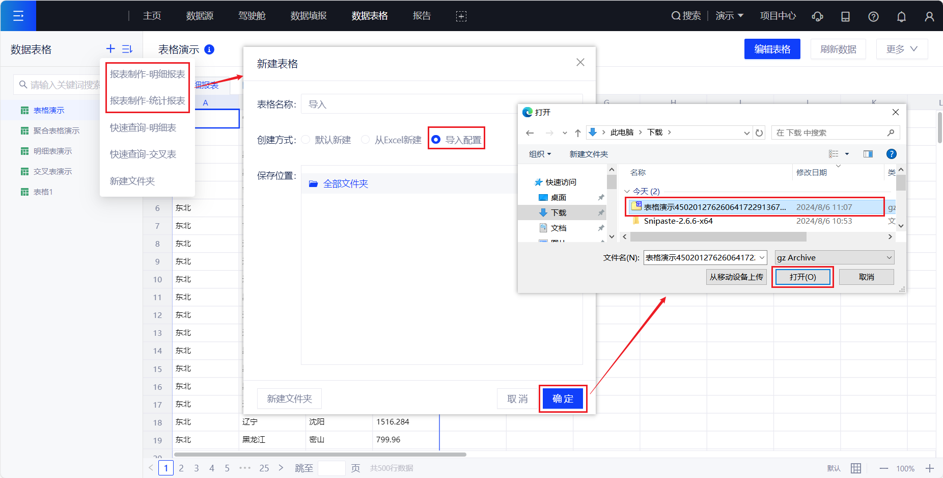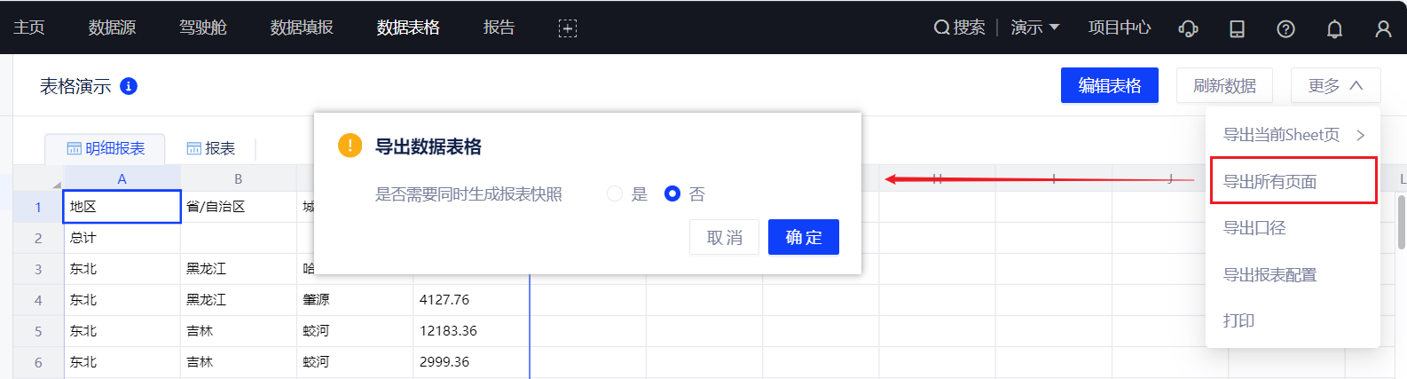 用户可导出sheet页面、所有页面、口径以及报表配置。