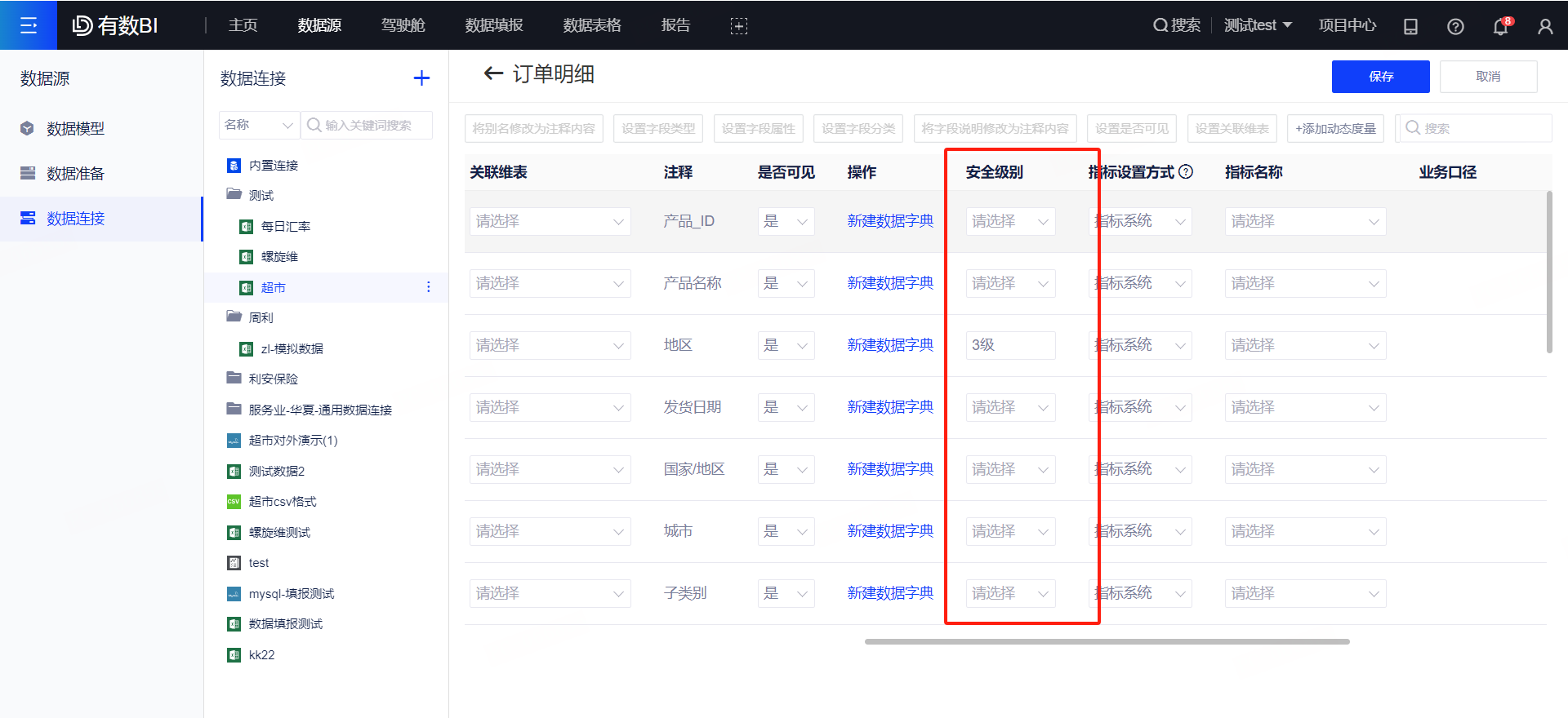 入口:【项目中心】-【数据源】-【数据连接】-【表信息】-【编辑模型元信息设置】-【安全等级】,对所需要的字段设置安全等级即可。