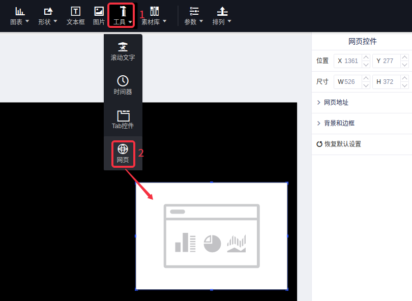 (1)选择“工具”控件,然后点击“网页”;