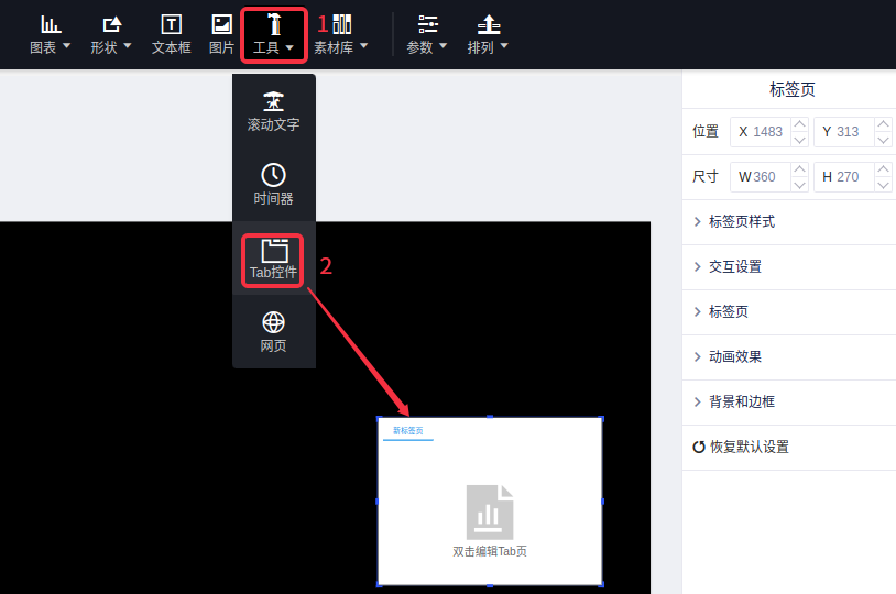(4)您也可以直接在Tab控件内创建图表,在Tab控件的编辑状态下(双击Tab控件进入编辑状态),点击图表控件添加图表,会直接将图表添加在Tab控件里面;