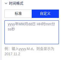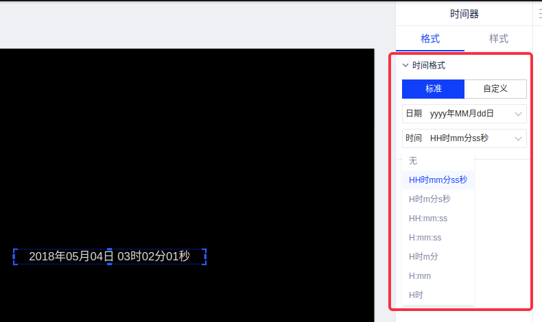 选中时间器,在右侧控制区切换时间器的格式tab,可勾选标准时间格式和自定义时间格式,标准时间格式如下图;