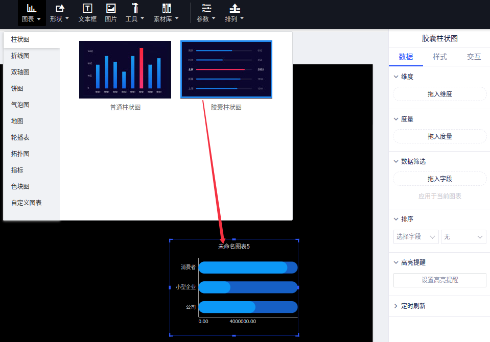 (1)选择“图表”控件,找到“胶囊柱状图”并添加到画布中;